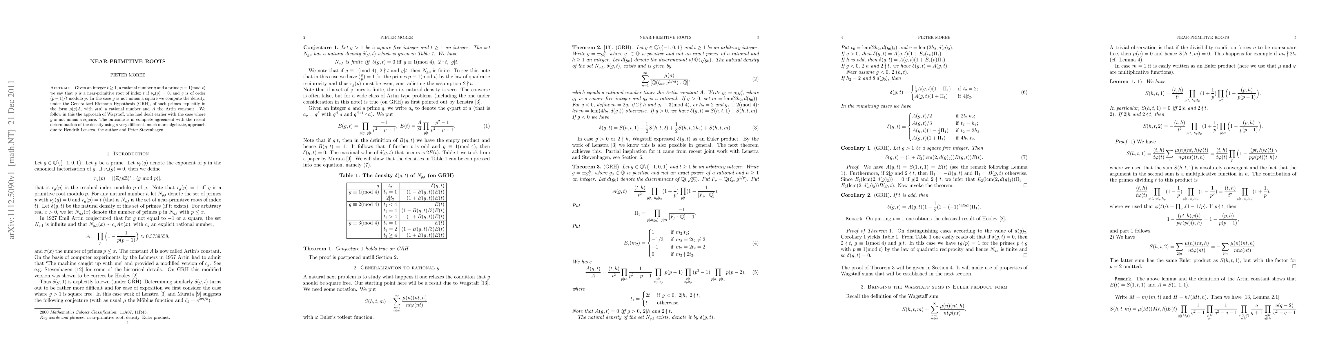 Given an integer $t\ge 1$, a rational number $g$ and a prime $p\equiv 1({\rm mod} t)$ we say that $g$ is a near-primitive root of index $t$ if $\nu_p(g)=0$, and $g$ is of order $(p-1)/t$ modulo $p$. In the case $g$ is not minus a square we compute the density, under the Generalized Riemann Hypothesis (GRH), of such primes explicitly in the form $\rho(g)A$, with $\rho(g)$ a rational number and $A$ the Artin constant. We follow in this the approach of Wagstaff, who had dealt earlier with the case where $g$ is not minus a square. The outcome is in complete agreement with the recent determination of the density using a very different, much more algebraic, approach due to Hendrik Lenstra, the author and Peter Stevenhagen.