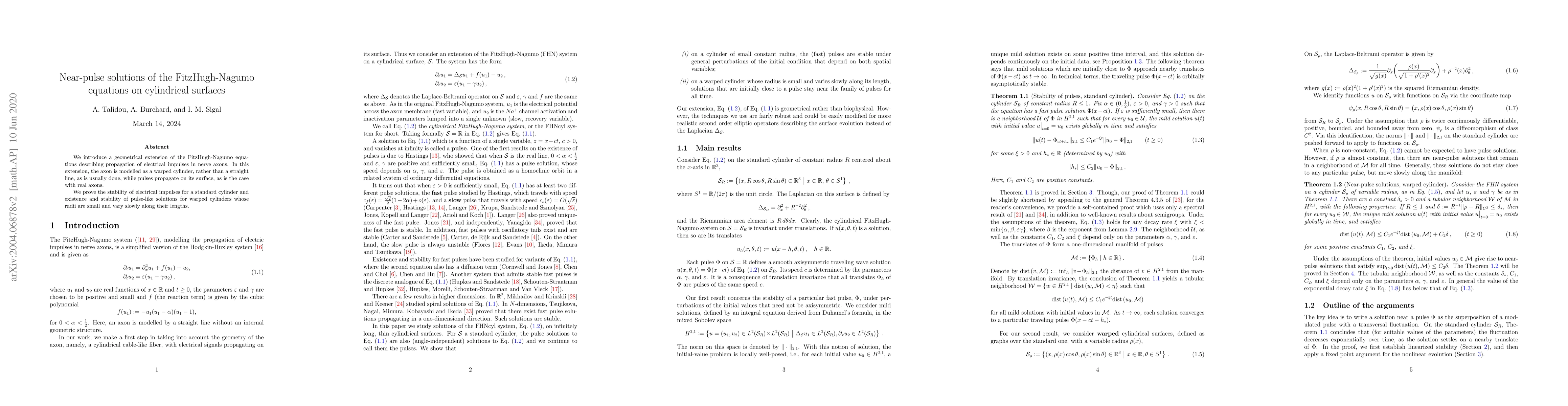 We introduce a geometrical extension of the FitzHugh-Nagumo equations describing propagation of electrical impulses in nerve axons. In this extension, the axon is modeled as a warped cylinder, rather than a straight line, as is usually done, while pulses propagate on its surface, as is the case with real axons. We prove the stability of electrical impulses for a standard cylinder and existence and stability of pulse-like solutions for warped cylinders whose radii are small and vary slowly along their lengths.