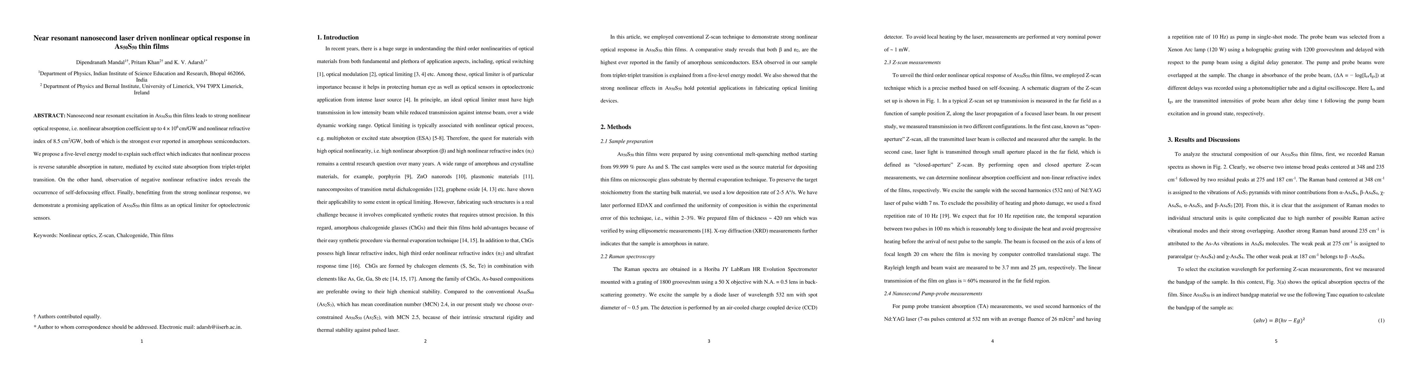 This paper reports on the strong nonlinear optical response in As50S50 thin films under nanosecond near resonant excitation, characterized by a high nonlinear absorption coefficient and refractive index. The study proposes a five-level energy model to explain the reverse saturable absorption mediated by triplet-triplet transitions, and demonstrates the material's potential as an optical limiter for optoelectronic sensors.