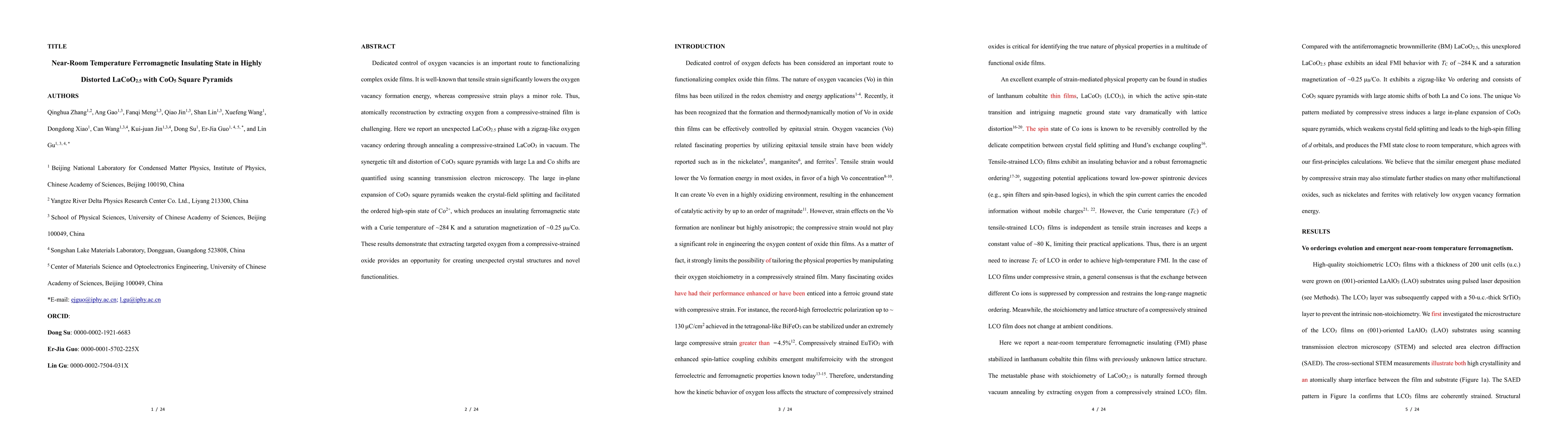 Dedicated control of oxygen vacancies is an important route to functionalizing complex oxide films. It is well-known that tensile strain significantly lowers the oxygen vacancy formation energy, whereas compressive strain plays a minor role. Thus, atomically reconstruction by extracting oxygen from a compressive-strained film is challenging. Here we report an unexpected LaCoO2.5 phase with a zigzag-like oxygen vacancy ordering through annealing a compressive-strained LaCoO3 in vacuum. The synergetic tilt and distortion of CoO5 square pyramids with large La and Co shifts are quantified using scanning transmission electron microscopy. The large in-plane expansion of CoO5 square pyramids weaken the crystal-field splitting and facilitated the ordered high-spin state of Co2+, which produces an insulating ferromagnetic state with a Curie temperature of ~284 K and a saturation magnetization of ~0.25 {\mu}B/Co. These results demonstrate that extracting targeted oxygen from a compressive-strained oxide provides an opportunity for creating unexpected crystal structures and novel functionalities.