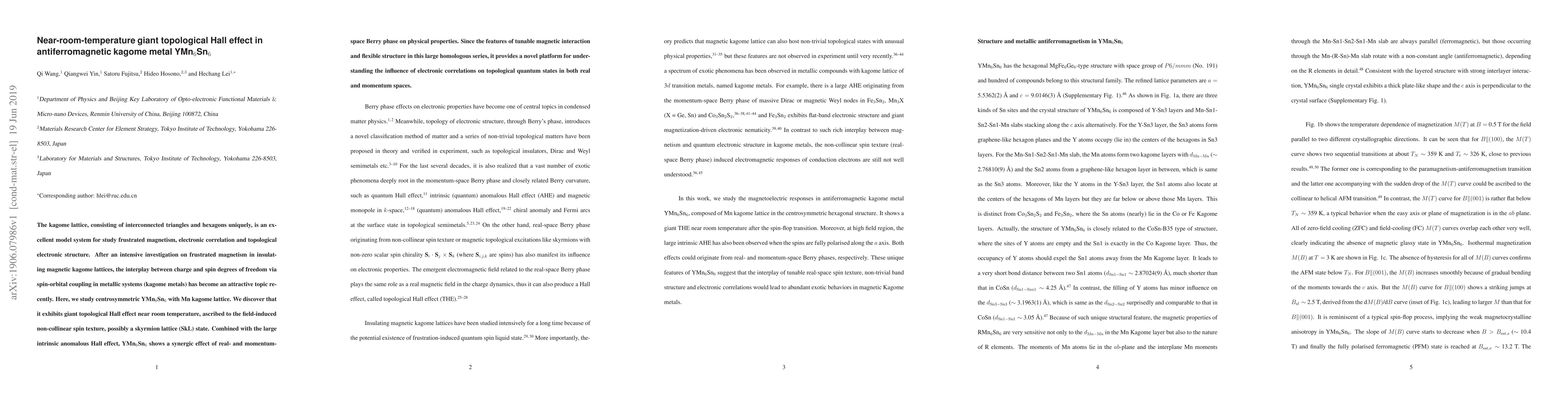 This paper reports the discovery of a giant topological Hall effect near room temperature in the centrosymmetric antiferromagnetic kagome metal YMn6Sn6, attributed to a field-induced non-collinear spin texture, potentially a skyrmion lattice state. The study highlights the interplay between charge and spin degrees of freedom in metallic kagome systems, offering a new platform for understanding topological quantum states.