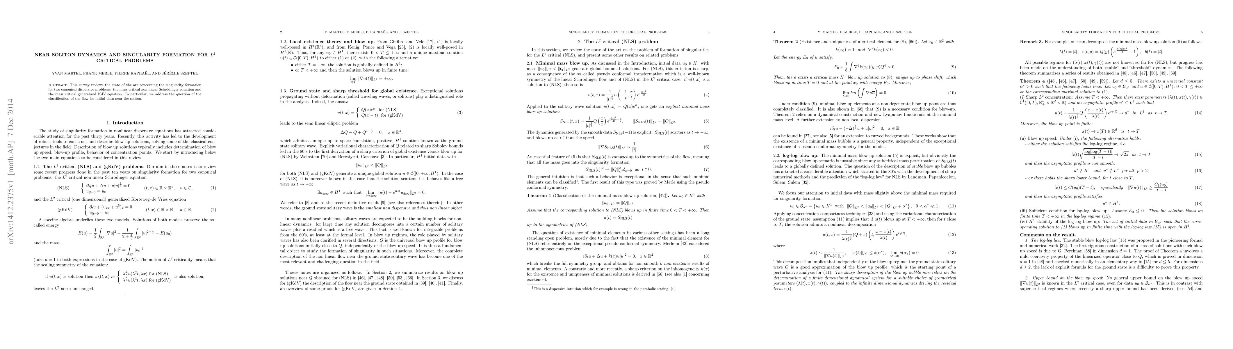 This survey explores the singularity formation and near soliton dynamics for $L^2$ critical dispersive problems, focusing on the mass critical nonlinear Schrödinger equation and the mass critical generalized KdV equation, with a particular emphasis on classifying the flow for initial data close to solitons.