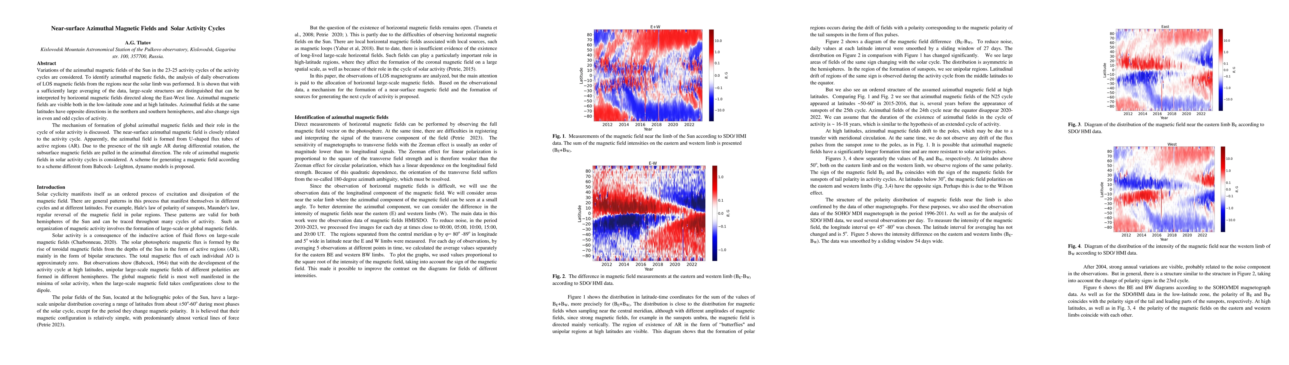 Variations of the azimuthal magnetic fields of the Sun in the 23-25 activity cycles of the activity cycles are considered. To identify azimuthal magnetic fields, the analysis of daily observations of LOS magnetic fields from the regions near the solar limb was performed. It is shown that with a sufficiently large averaging of the data, large-scale structures are distinguished that can be interpreted by horizontal magnetic fields directed along the East-West line. Azimuthal magnetic fields are visible both in the low-latitude zone and at high latitudes. Azimuthal fields at the same latitudes have opposite directions in the northern and southern hemispheres, and also change sign in even and odd cycles of activity. The mechanism of formation of global azimuthal magnetic fields and their role in the cycle of solar activity is discussed. The near-surface azimuthal magnetic field is closely related to the activity cycle. Apparently, the azimuthal field is formed from U-shaped flux tubes of active regions (AR). Due to the presence of the tilt angle AR during differential rotation, the subsurface magnetic fields are pulled in the azimuthal direction. The role of azimuthal magnetic fields in solar activity cycles is considered. A scheme for generating a magnetic field according to a scheme different from Babcock-Leighton dynamo models is proposed.