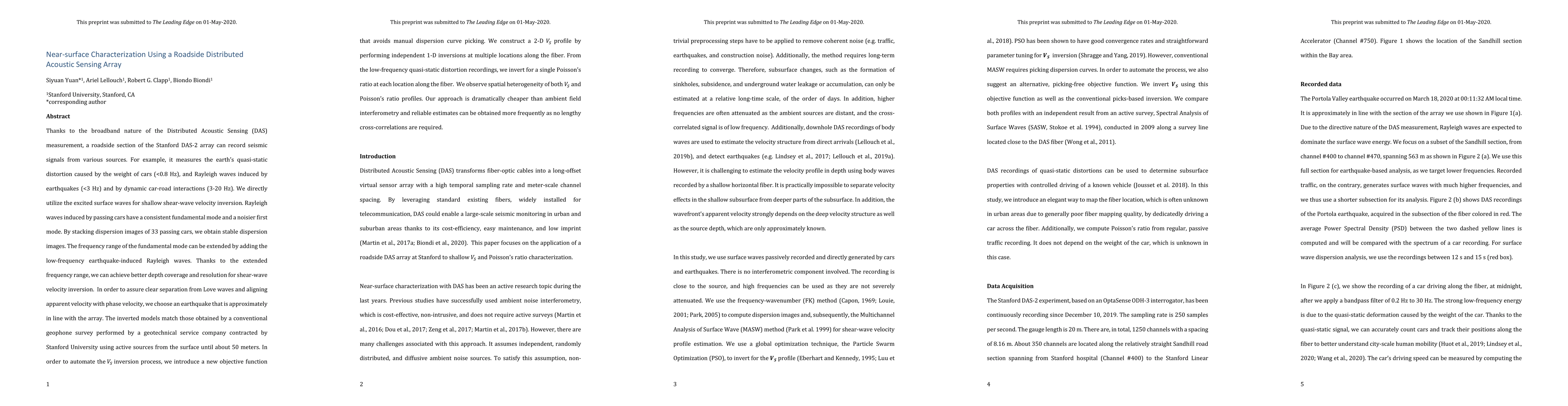 Thanks to the broadband nature of the Distributed Acoustic Sensing (DAS) measurement, a roadside section of the Stanford DAS-2 array can record seismic signals from various sources. For example, it measures the earth's quasi-static distortion caused by the weight of cars (<0.8 Hz), and Rayleigh waves induced by earthquakes (<3 Hz) and by dynamic car-road interactions (3-20 Hz). We directly utilize the excited surface waves for shallow shear-wave velocity inversion. Rayleigh waves induced by passing cars have a consistent fundamental mode and a noisier first mode. By stacking dispersion images of 33 passing cars, we obtain stable dispersion images. The frequency range of the fundamental mode can be extended by adding the low-frequency earthquake-induced Rayleigh waves. Thanks to the extended frequency range, we can achieve better depth coverage and resolution for shear-wave velocity inversion. In order to assure clear separation from Love waves and aligning apparent velocity with phase velocity, we choose an earthquake that is approximately in line with the array. The inverted models match those obtained by a conventional geophone survey performed by a geotechnical service company contracted by Stanford University using active sources from the surface until about 50 meters. In order to automate the Vs inversion process, we introduce a new objective function that avoids manual dispersion curve picking. We construct a 2-D Vs profile by performing independent 1-D inversions at multiple locations along the fiber. From the low-frequency quasi-static distortion recordings, we invert for a single Poisson's ratio at each location along the fiber. We observe spatial heterogeneity of both Vs and Poisson's ratio profiles. Our approach is dramatically cheaper than ambient field interferometry and reliable estimates can be obtained more frequently as no lengthy cross-correlations are required.