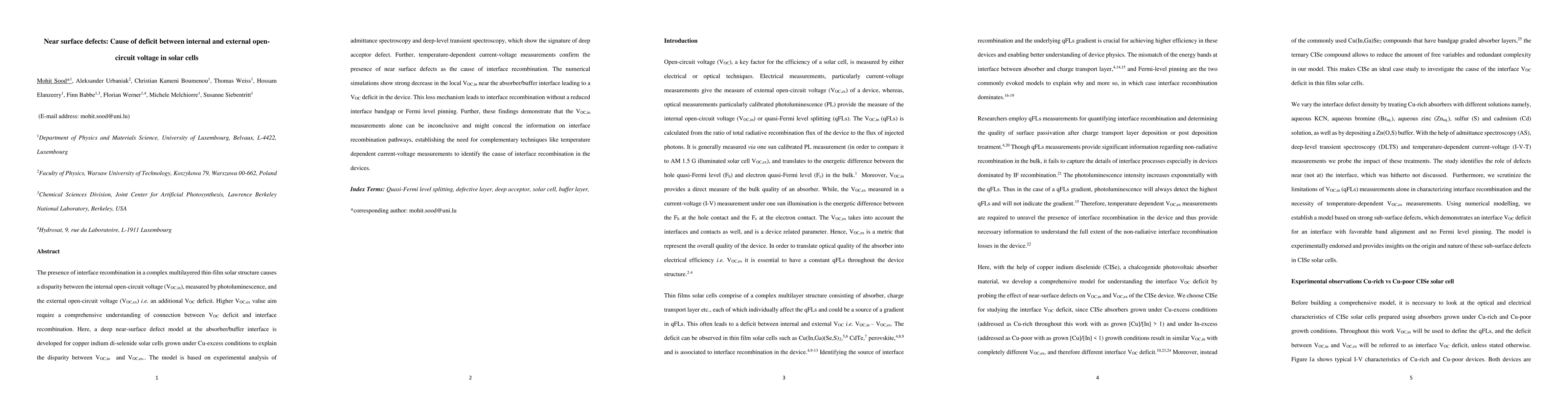 This research investigates the cause of the VOC deficit in multilayered thin-film solar cells, attributing it to near-surface defects at the absorber/buffer interface, particularly in Cu(In,Ga)Se2 cells grown under Cu excess. Experimental and numerical analysis reveal that interface recombination due to these defects leads to a disparity between internal and external open-circuit voltage measurements.