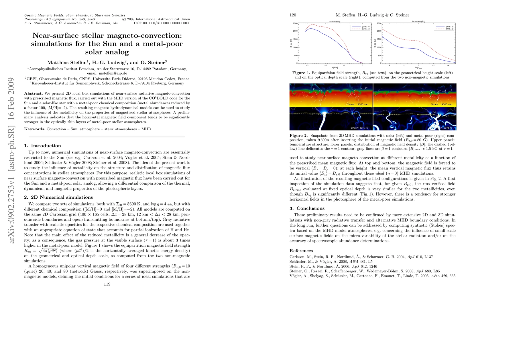 This paper presents 2D simulations of near-surface magneto-convection for the Sun and a metal-poor solar analog using the MHD CO5BOLD code, revealing stronger horizontal magnetic fields in the latter's optically thin layers. The study highlights the impact of metallicity on magnetized stellar atmospheres.