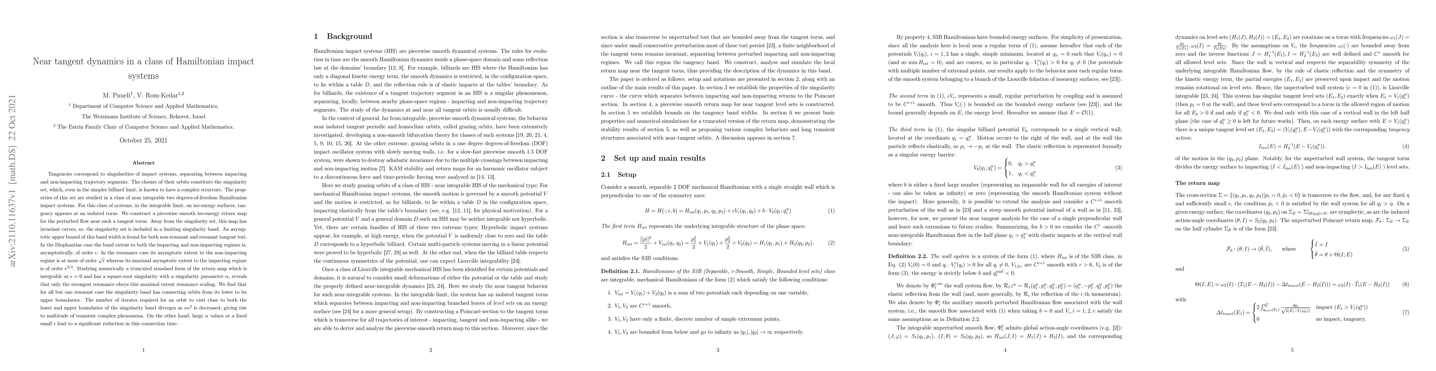 Tangencies correspond to singularities of impact systems, separating between impacting and non-impacting trajectory segments. The closure of their orbits constitute the singularity set, which, even in the simpler billiard limit, is known to have a complex structure. The properties of this set are studied in a class of near integrable two degrees-of-freedom Hamiltonian impact systems. For this class of systems, in the integrable limit, on iso-energy surfaces, tangency appears at an isolated torus. We construct a piecewise smooth iso-energy return map for the perturbed flow near such a tangent torus and study its properties. Away from the singularity set, this map has invariant curves, so, the singularity set is included in a limiting singularity band. An asymptotic upper bound of this band width is found for both non-resonant and resonant tangent tori. Numerical simulations of the dynamics inside the band reveal long transients, yet, these are made shorter when the singular term coefficient is large.