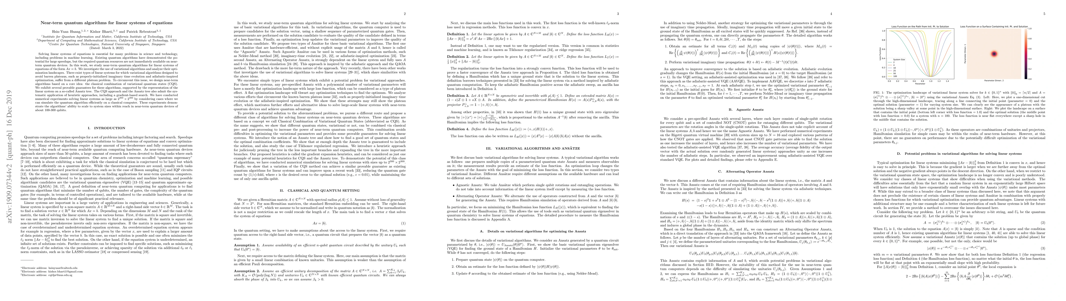 This paper explores near-term quantum algorithms for solving linear systems of equations, focusing on variational methods and their optimization landscapes. The authors propose a classical combination of variational quantum states (CQS) approach, supported by an Ansatz tree, to overcome optimization plateaus and demonstrate scalability to systems feasible for near-term quantum devices with 100-300 qubits.