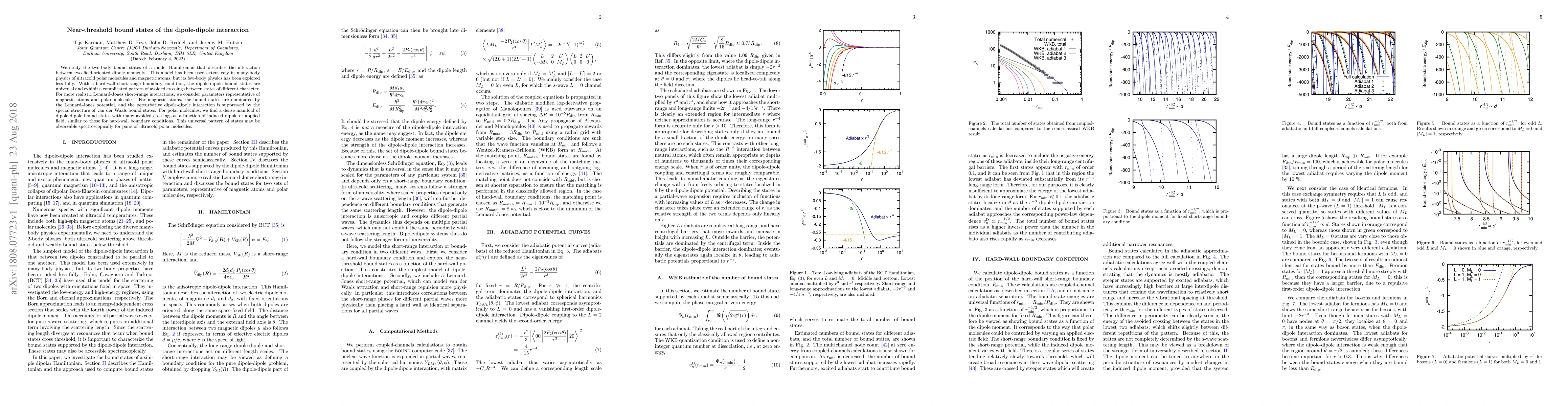 This paper investigates two-body bound states in a model Hamiltonian describing dipole-dipole interactions, highlighting universal patterns of avoided crossings under hard-wall and Lennard-Jones conditions. For magnetic atoms, the Lennard-Jones potential dominates, while for polar molecules, numerous dipole-dipole bound states are observed.