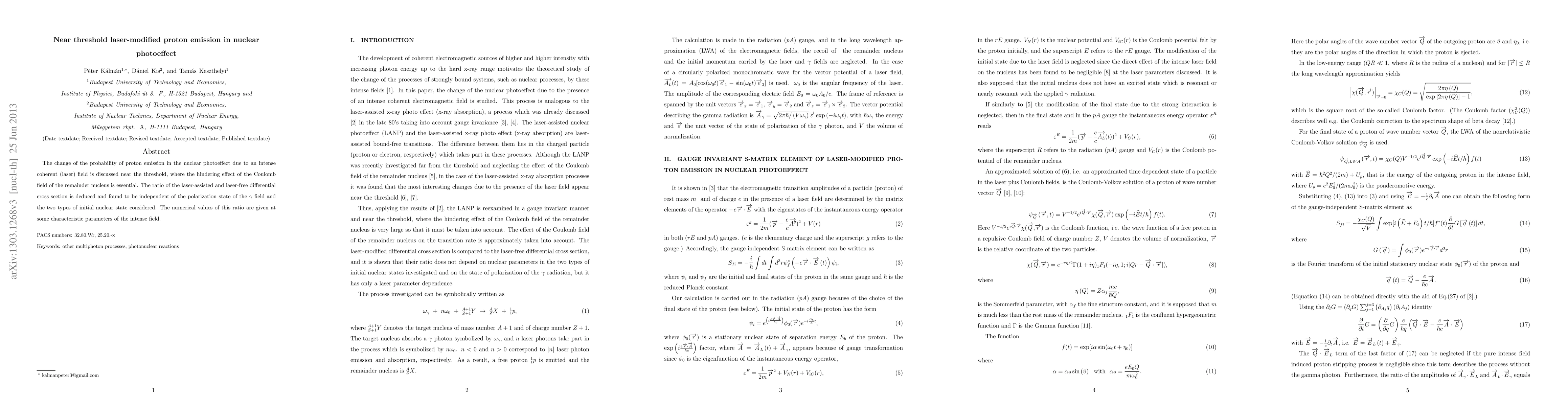 The change of the probability of proton emission in nuclear photoeffect due to an intense coherent (laser) field is discussed near the threshold, where the hindering effect of the Coulomb field of the remainder nucleus is essential. The ratio of laser-assisted and laser free differential cross section is deduced and found to be independent of the polarization state of the $\gamma $ field and the two types of initial nuclear state considered. The numerical values of this ratio are given at some characteristic parameters of the intense field.