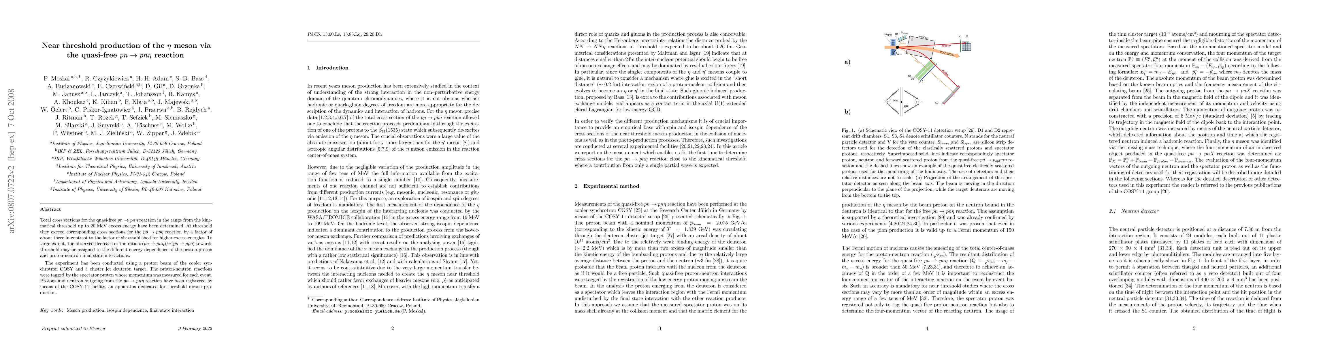 This study investigates the near-threshold production of eta mesons via quasi-free pn --> pn eta reactions, finding that total cross sections at threshold are about three times higher than for pp --> pp eta reactions, contrasting with the six-fold higher ratio at higher energies. The observed decrease is attributed to differing energy dependencies of proton-proton and proton-neutron final state interactions.