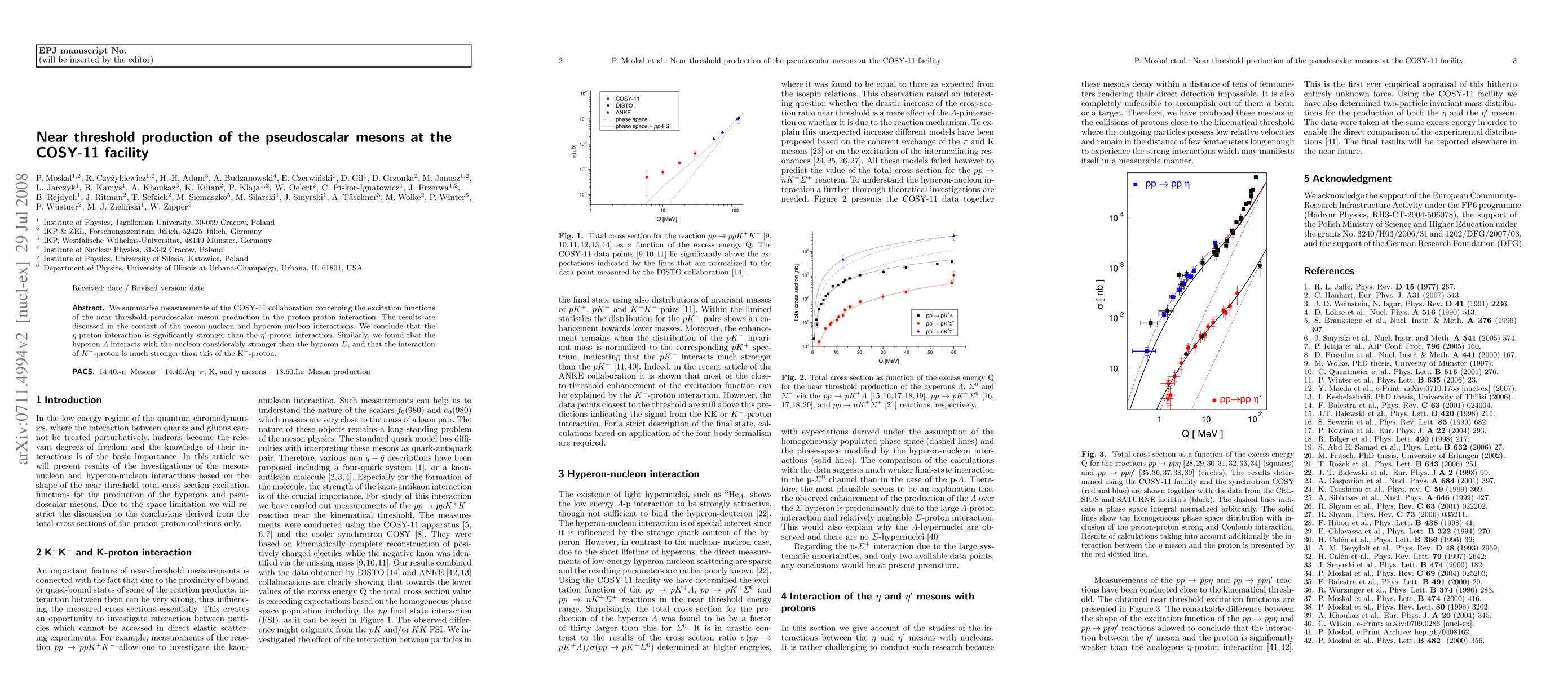 Summary: The COSY-11 collaboration reports on near threshold production of pseudoscalar mesons in proton-proton interactions, revealing stronger interactions for $\eta$-proton compared to eta'-proton, and a significantly stronger interaction for hyperon Lambda with nucleons than for hyperon Sigma, along with a much stronger (K-)-proton interaction than (K+)-proton.