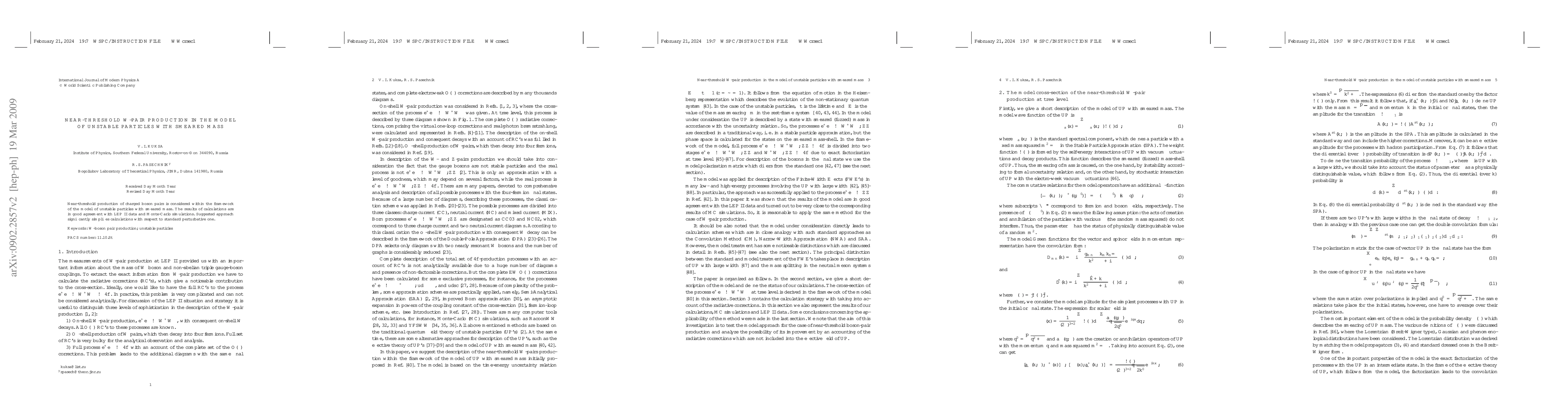 This paper investigates near-threshold W-pair production using a model of unstable particles with smeared mass, yielding results consistent with LEP II data and Monte-Carlo simulations, while simplifying calculations compared to standard perturbative methods.