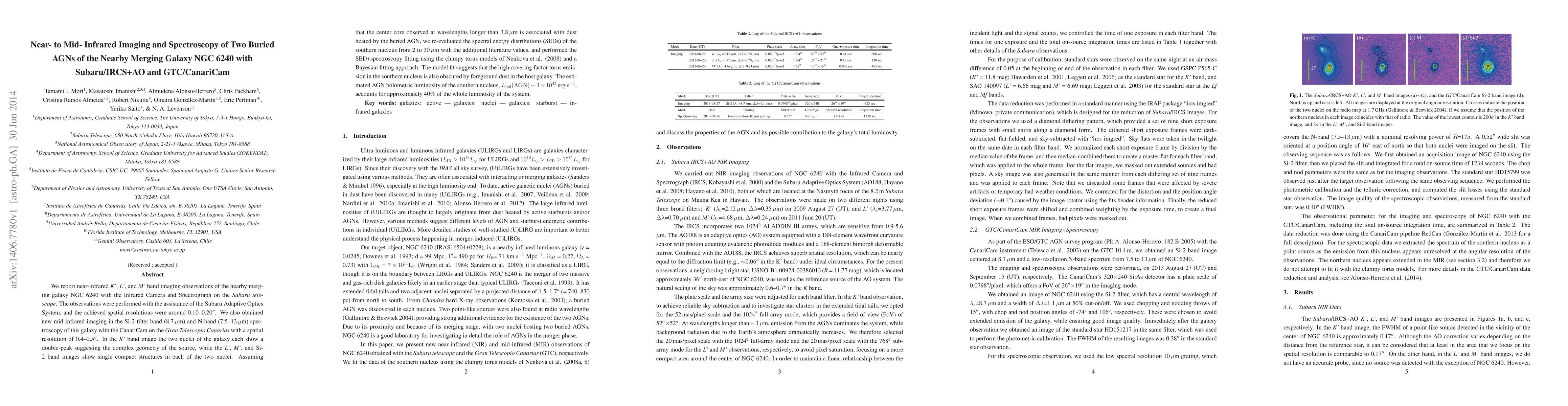 We report near-infrared K', L', and M' band imaging observations of the nearby merging galaxy NGC 6240 with the Infrared Camera and Spectrograph on the Subaru telescope. The observations were performed with the assistance of the Subaru Adaptive Optics System, and the achieved spatial resolutions were around 0.10--0.20$^{\prime\prime}$. We also obtained new mid-infrared imaging in the Si-2 filter band (8.7$\mu$m) and N-band (7.5--13$\mu$m) spectroscopy of this galaxy with the CanariCam on the Gran Telescopio Canarias with a spatial resolution of 0.4--0.5$^{\prime\prime}$. In the K' band image the two nuclei of the galaxy each show a double-peak suggesting the complex geometry of the source, while the L', M', and Si-2 band images show single compact structures in each of the two nuclei. Assuming that the center core observed at wavelengths longer than 3.8$\mu$m is associated with dust heated by the buried AGN, we re-evaluated the spectral energy distributions (SEDs) of the southern nucleus from 2 to 30$\mu$m with the additional literature values, and performed the SED+spectroscopy fitting using the clumpy torus models of Nenkova et al. (2008) and a Bayesian fitting approach. The model fit suggests that the high covering factor torus emission in the southern nucleus is also obscured by foreground dust in the host galaxy. The estimated AGN bolometric luminosity of the southern nucleus, $L_{\rm bol}({\rm AGN})\sim1\times10^{45}$ [erg$\cdot$s$^{-1}$], accounts for approximately 40% of the whole luminosity of the system.