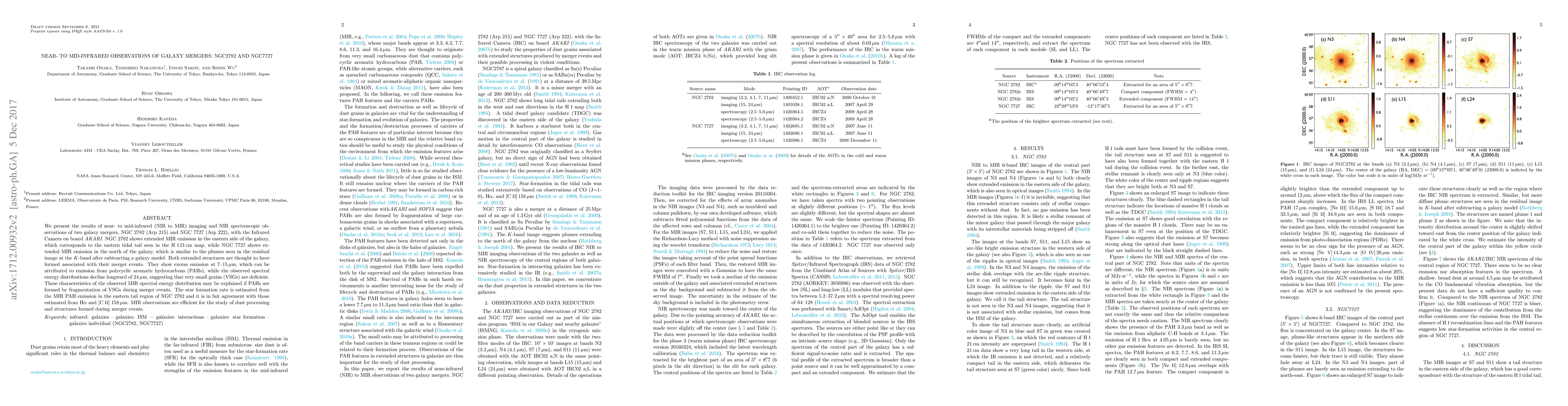 We present the results of near- to mid-infrared (NIR to MIR) imaging and NIR spectroscopic observations of two galaxy mergers, NGC 2782 (Arp 215) and NGC 7727 (Arp 222), with the Infrared Camera on board AKARI. NGC 2782 shows extended MIR emission in the eastern side of the galaxy, which corresponds to the eastern tidal tail seen in the HI 21 cm map, while NGC 7727 shows extended MIR emission in the north of the galaxy, which is similar to the plumes seen in the residual image at the K-band after subtracting a galaxy model. Both extended structures are thought to have formed associated with their merger events. They show excess emission at 7--15 micron, which can be attributed to emission from polycyclic aromatic hydrocarbons (PAHs), while the observed spectral energy distributions decline longward of 24 micron, suggesting that very small grains (VSGs) are deficient. These characteristics of the observed MIR spectral energy distribution may be explained if PAHs are formed by fragmentation of VSGs during merger events. The star formation rate is estimated from the MIR PAH emission in the eastern tail region of NGC 2782 and it is in fair agreement with those estimated from Halpha and [CII] 158 micron. MIR observations are efficient for the study of dust processing and structures formed during merger events.