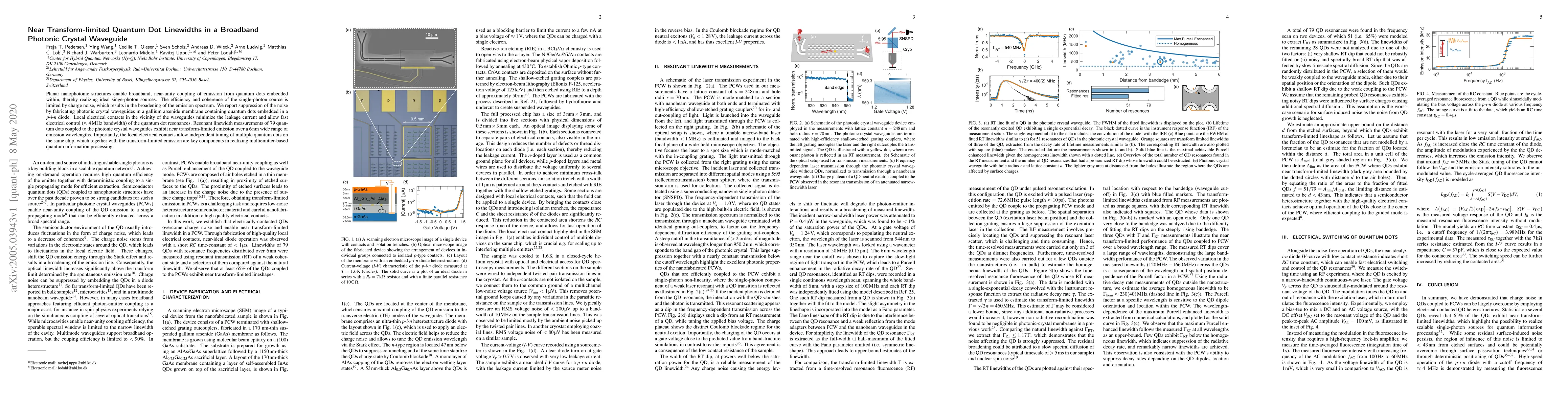 This paper reports on the fabrication of photonic crystal waveguides in gallium arsenide membranes to achieve near-transform-limited linewidths for quantum dot emission, minimizing charge noise and enabling efficient single-photon sources. The study demonstrates independent tuning of multiple quantum dots for potential quantum information processing applications.