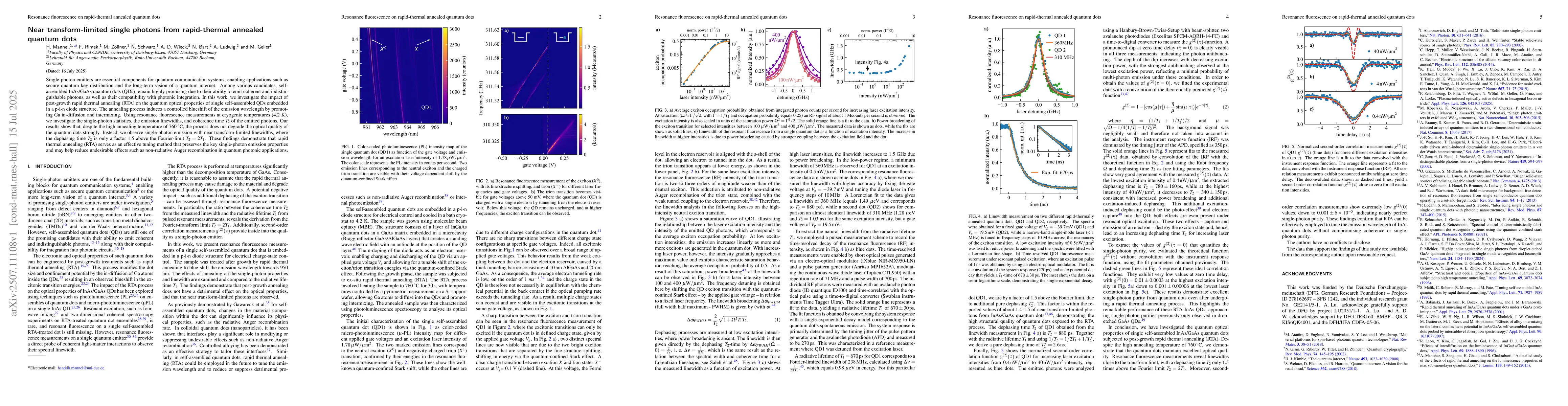 Single-photon emitters are essential components for quantum communication systems, enabling applications such as secure quantum key distribution and the long-term vision of a quantum internet. Among various candidates, self-assembled InAs/GaAs quantum dots (QDs) remain highly promising due to their ability to emit coherent and indistinguishable photons, as well as their compatibility with photonic integration. In this work, we investigate the impact of post-growth rapid thermal annealing (RTA) on the quantum optical properties of single self-assembled QDs embedded in a p-i-n diode structure. The annealing process induces a controlled blueshift of the emission wavelength by promoting Ga in-diffusion and intermixing. Using resonance fluorescence measurements at cryogenic temperatures (4.2 K), we investigate the single-photon statistics, the emission linewidths, and coherence time $T_2$ of the emitted photons. Our results show that, despite the high annealing temperature of $760^\circ$C, the process does not degrade the optical quality of the quantum dots strongly. Instead, we observe single-photon emission with near transform-limited linewidths, where the dephasing time $T_2$ is only a factor 1.5 above the Fourier-limit $T_2=2T_1$. These findings demonstrate that rapid thermal annealing (RTA) serves as an effective tuning method that preserves the key single-photon emission properties and may help reduce undesirable effects such as non-radiative Auger recombination in quantum photonic applications.