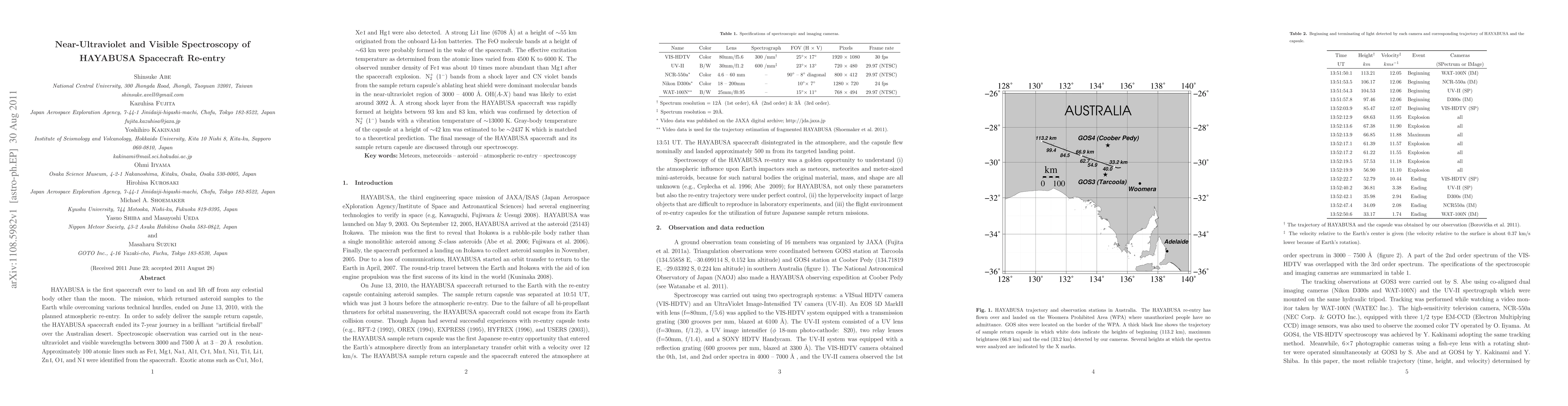 Scientists analyzed the HAYABUSA spacecraft re-entry into Earth's atmosphere using near-ultraviolet and visible spectroscopy, revealing atomic lines from various elements and exotic atoms, as well as a strong shock layer and ablating molecular bands.