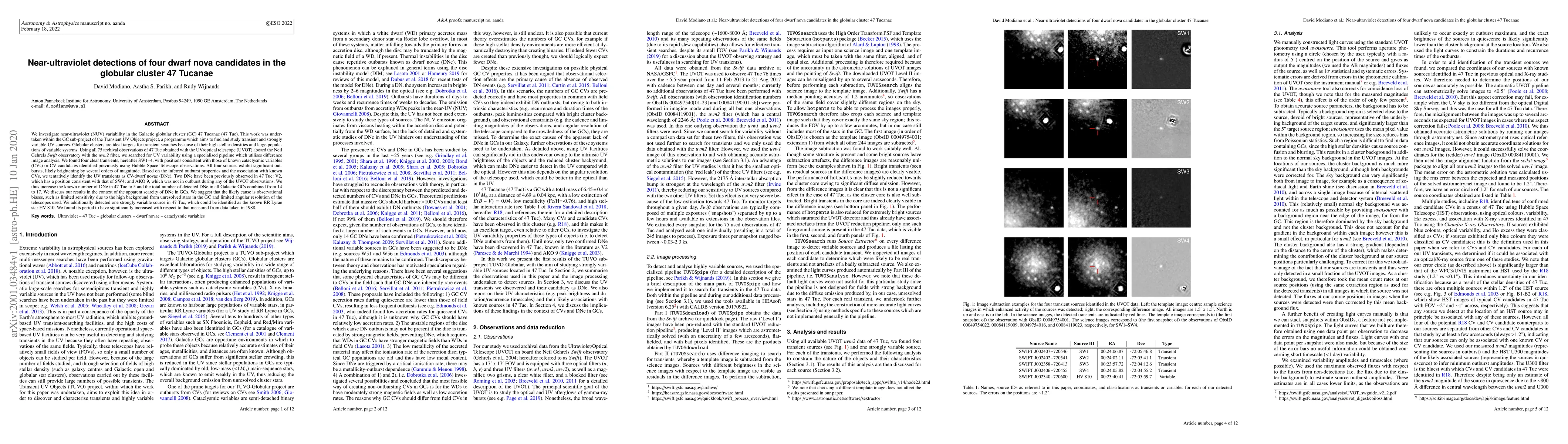 We investigate near-ultraviolet (NUV) variability in the Galactic globular cluster (GC) 47 Tucanae (47 Tuc). This work was undertaken within the GC sub-project of the Transient UV Objects project, a programme which aims to find and study transient and strongly variable UV sources. Globular clusters are ideal targets for transient searches because of their high stellar densities and large populations of variable systems. Using all archival observations of 47 Tuc obtained with the UV/optical telescope (UVOT) aboard the Neil Gehrels Swift observatory with the uvm2 filter, we searched for UV variability using a specialised pipeline which utilises difference image analysis. We found four clear transients, hereafter SW1-4, with positions consistent with those of known cataclysmic variables (CVs) or CV candidates identified previously using Hubble Space Telescope observations. All four sources exhibit significant outbursts. Based on the inferred outburst properties and the association with known CVs, we tentatively identify the UV transients as CV-dwarf novae (DNe). Two DNe have been previously observed in 47 Tuc: V2, which has a position consistent with that of SW4; and AKO 9, which was not in outburst during any of the UVOT observations. We thus increase the known number of DNe in 47 Tuc to 5 and the total number of detected DNe in all Galactic GCs combined from 14 to 17. We discuss our results in the context of the apparent scarcity of DNe in GCs. We suggest that the likely cause is observational biases, such as limited sensitivity due to the high background from unresolved stars in the GC and limited angular resolution of the telescopes used. We additionally detected one strongly variable source in 47 Tuc, which could be identified as the known RR Lyrae star HV 810. We found its period to have significantly increased with respect to that measured from data taken in 1988.