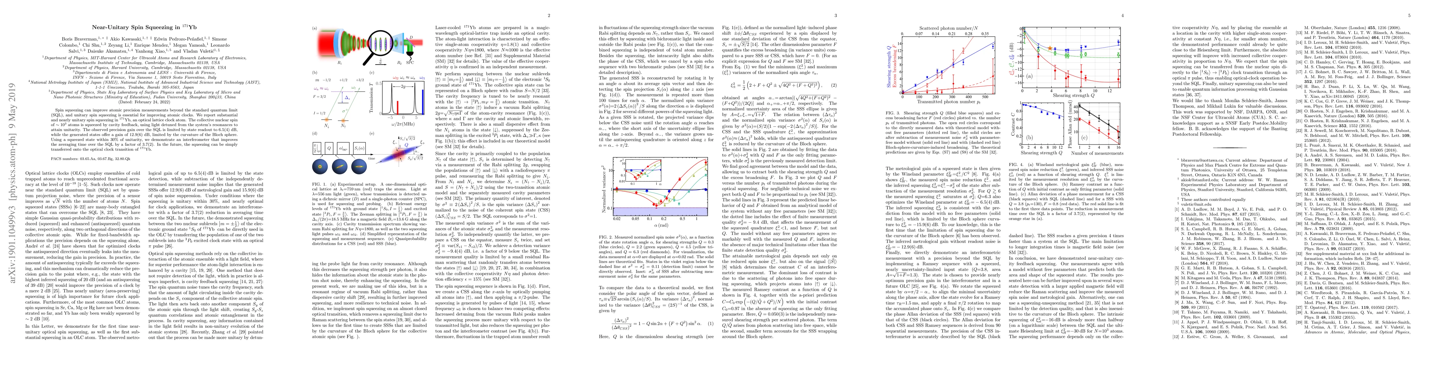 The research demonstrates near-unitary spin squeezing in $^{171}$Yb atoms, achieving a precision gain of 12.9 dB, which is limited by the curvature of the Bloch sphere. The practical application shows a 3.7-fold improvement in measurement time using a nearly unitary squeezed state.