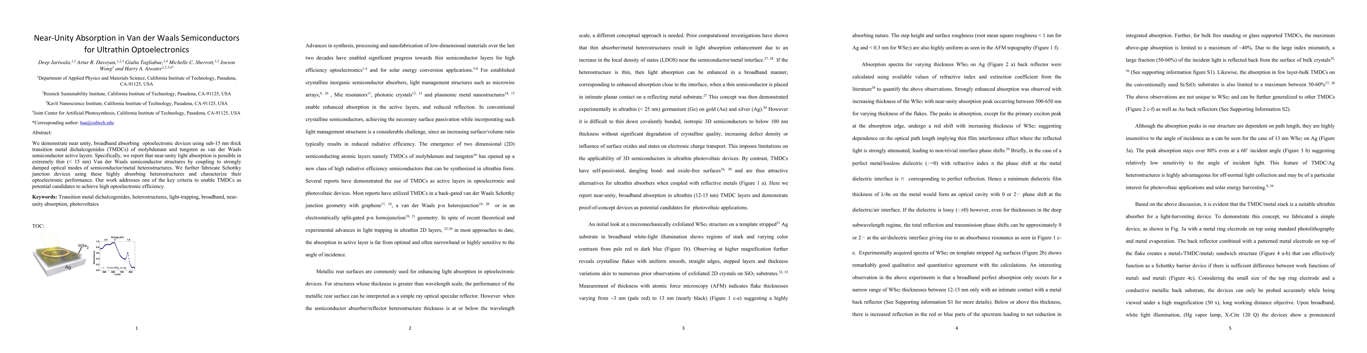 We demonstrate near unity, broadband absorbing optoelectronic devices using sub-15 nm thick transition metal dichalcogenides (TMDCs) of molybdenum and tungsten as van der Waals semiconductor active layers. Specifically, we report that near-unity light absorption is possible in extremely thin (< 15 nm) Van der Waals semiconductor structures by coupling to strongly damped optical modes of semiconductor/metal heterostructures. We further fabricate Schottky junction devices using these highly absorbing heterostructures and characterize their optoelectronic performance. Our work addresses one of the key criteria to enable TMDCs as potential candidates to achieve high optoelectronic efficiency.