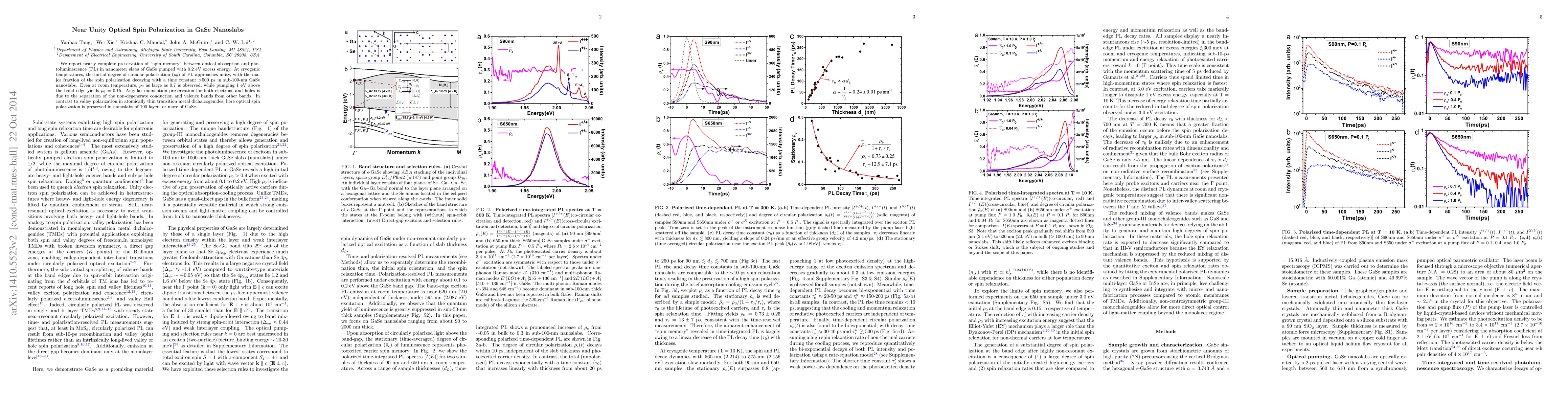 This paper reports nearly complete optical spin polarization preservation in GaSe nanoslabs, with initial circular polarization approaching unity at cryogenic temperatures, and significant polarization even at room temperature. The preservation is attributed to the separation of conduction and valence bands, contrasting with valley polarization in other materials.