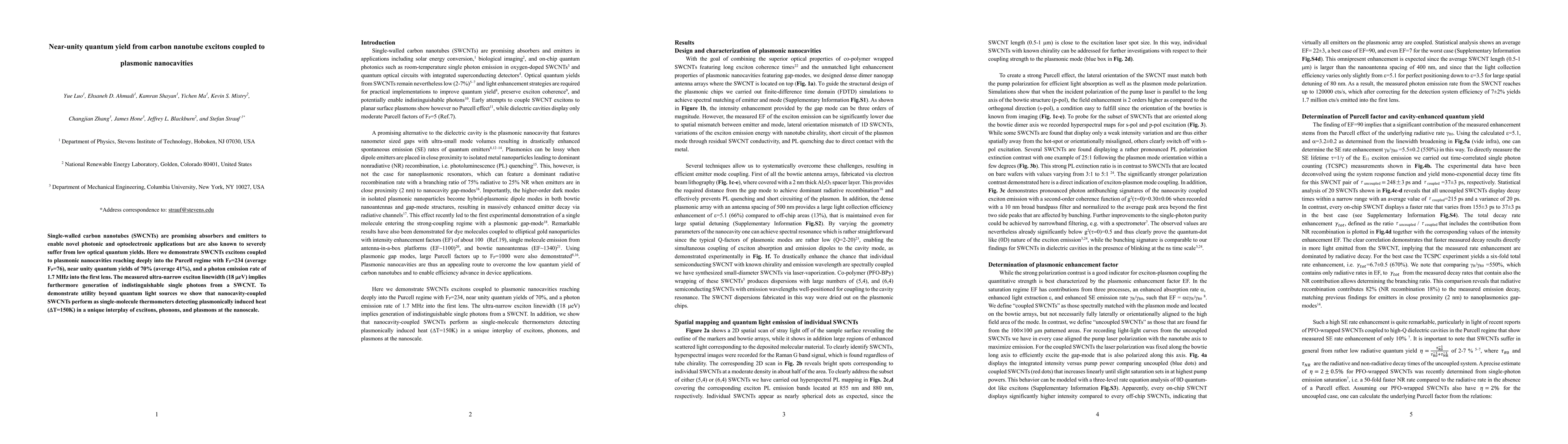 This paper demonstrates that single-walled carbon nanotubes (SWCNTs) excitons coupled to plasmonic nanocavities achieve near-unity quantum yields of 70% on average, significantly improving optical efficiency. It also shows these coupled SWCNTs can act as single-molecule thermometers by detecting nanoscale plasmonic heat.
