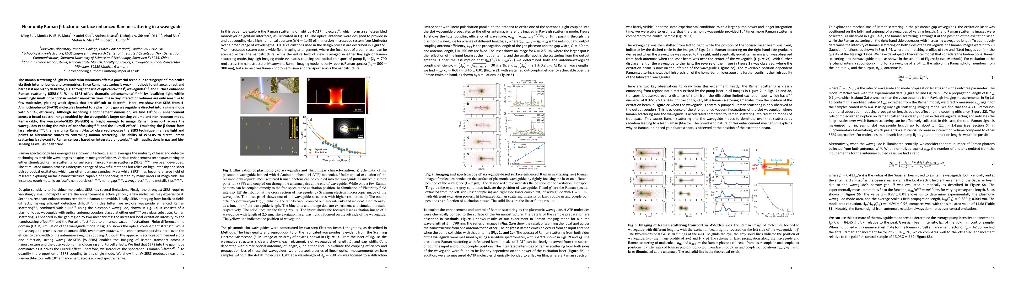 The Raman scattering of light by molecular vibrations offers a powerful technique to 'fingerprint' molecules via their internal bonds and symmetries. Since Raman scattering is weak, methods to enhance, direct and harness it are highly desirable, e.g. through the use of optical cavities, waveguides, and surface enhanced Raman scattering (SERS). While SERS offers dramatic enhancements by localizing light within vanishingly small 'hot-spots' in metallic nanostructures, these tiny interaction volumes are only sensitive to few molecules, yielding weak signals that are difficult to detect. Here, we show that SERS from 4-Aminothiophenol (4-ATP) molecules bonded to a plasmonic gap waveguide is directed into a single mode with >99% efficiency. Although sacrificing a confinement dimension, we find 10$^4$ times SERS enhancement across a broad spectral range enabled by the waveguide's larger sensing volume and non-resonant mode. Remarkably, the waveguide-SERS (W-SERS) is bright enough to image Raman transport across the waveguides exposing the roles of nanofocusing and the Purcell effect. Emulating the $\beta$-factor from laser physics, the near unity Raman $\beta$-factor observed exposes the SERS technique in a new light and points to alternative routes to controlling Raman scattering. The ability of W-SERS to direct Raman scattering is relevant to Raman sensors based on integrated photonics with applications in gas and bio-sensing as well as healthcare.