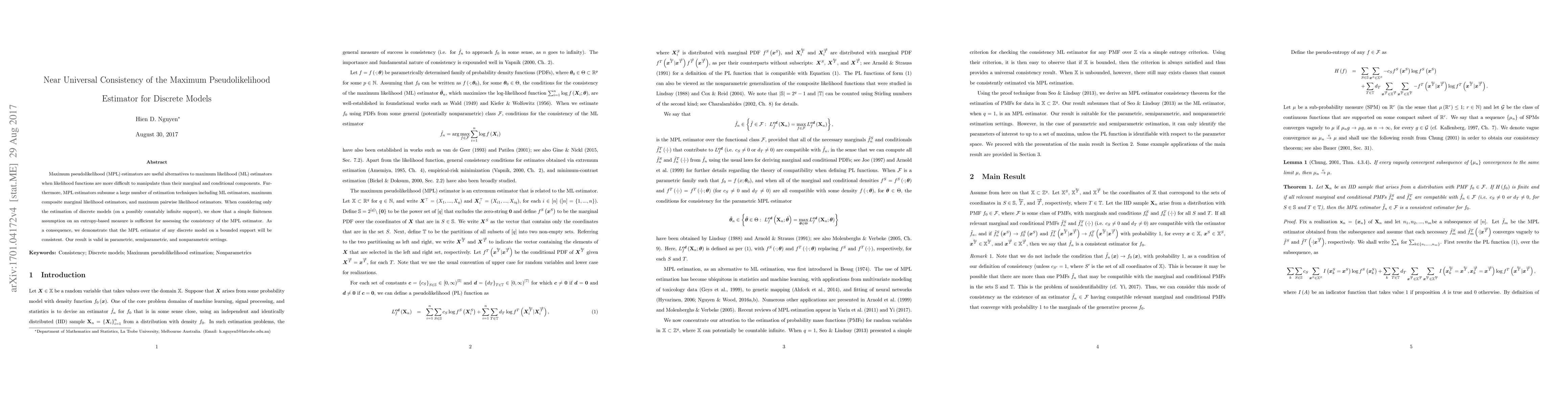 This paper demonstrates that the maximum pseudolikelihood estimator (MPL) is nearly universally consistent for estimating discrete models, provided a finiteness assumption on an entropy-based measure is met. The MPL estimator is shown to be consistent for any discrete model with bounded support across parametric, semiparametric, and nonparametric settings.