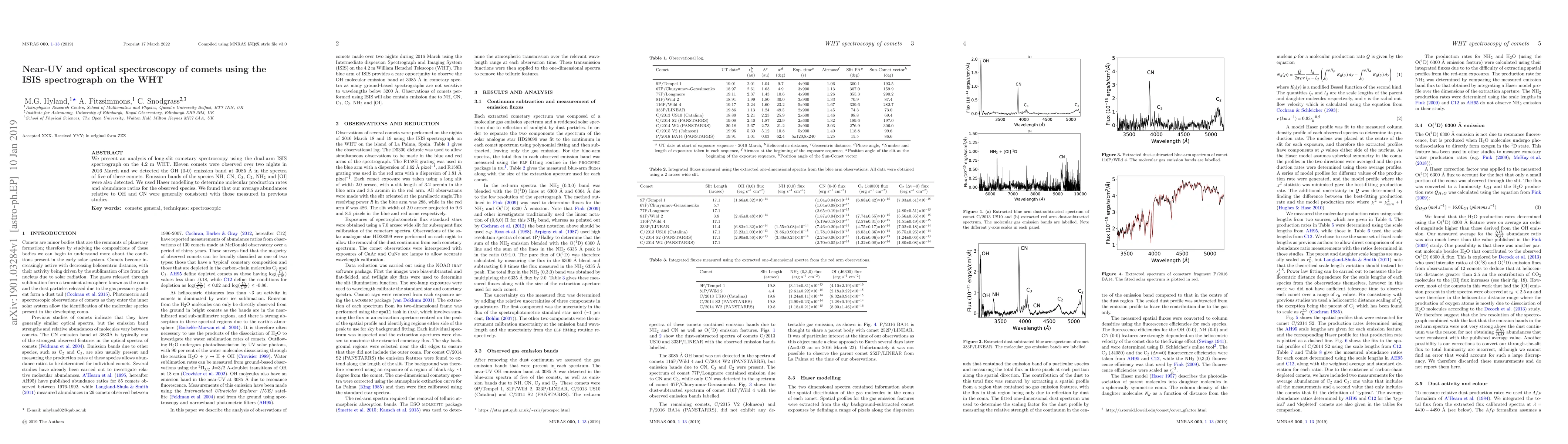 We present an analysis of long-slit cometary spectroscopy using the dual-arm ISIS spectrograph on the 4.2 m WHT. Eleven comets were observed over two nights in 2016 March and we detected the OH (0-0) emission band at 3085 {\AA} in the spectra of five of these comets. Emission bands of the species NH, CN, C$_{3}$, C$_{2}$, NH$_{2}$ and [OI] were also detected. We used Haser modelling to determine molecular production rates and abundance ratios for the observed species. We found that our average abundances relative to OH and CN were generally consistent with those measured in previous studies.