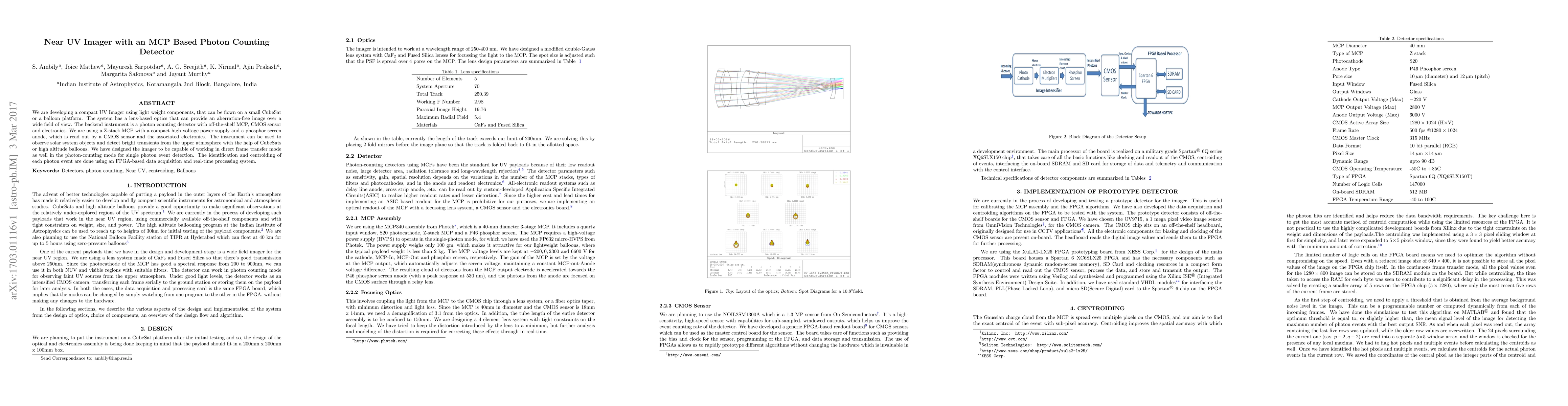 This paper describes the development of a compact near UV Imager for CubeSats and balloons, featuring aberration-free optics and a photon counting detector with MCP and CMOS sensor. The system supports both frame transfer and single photon detection modes, utilizing FPGA for real-time data acquisition and processing.