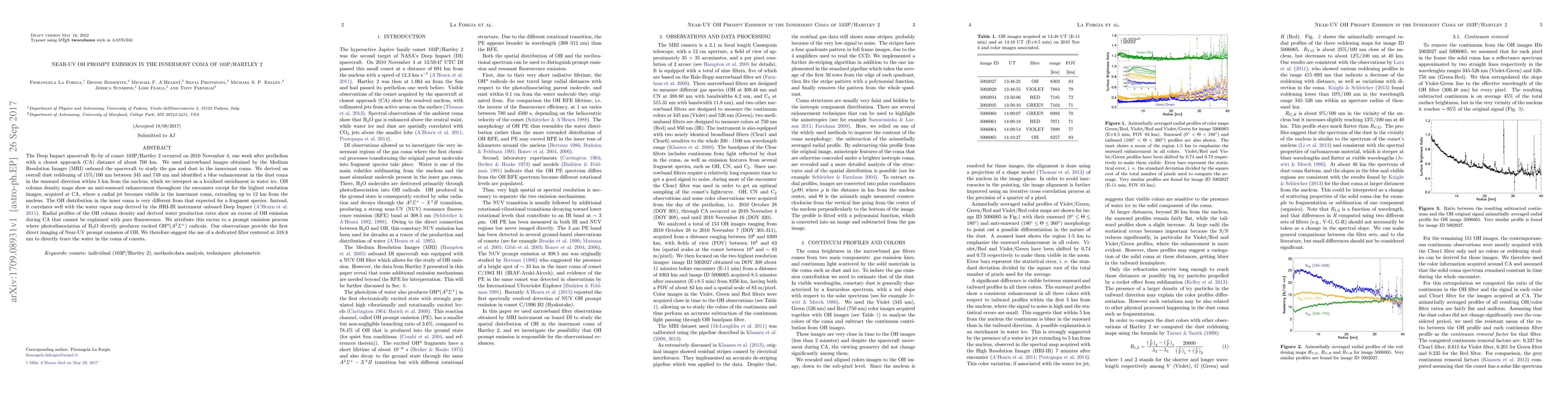 The Deep Impact spacecraft fly-by of comet 103P/Hartley 2 occurred on 2010 November 4, one week after perihelion with a closest approach (CA) distance of about 700 km. We used narrowband images obtained by the Medium Resolution Imager (MRI) onboard the spacecraft to study the gas and dust in the innermost coma. We derived an overall dust reddening of 15\%/100 nm between 345 and 749 nm and identified a blue enhancement in the dust coma in the sunward direction within 5 km from the nucleus, which we interpret as a localized enrichment in water ice. OH column density maps show an anti-sunward enhancement throughout the encounter except for the highest resolution images, acquired at CA, where a radial jet becomes visible in the innermost coma, extending up to 12 km from the nucleus. The OH distribution in the inner coma is very different from that expected for a fragment species. Instead, it correlates well with the water vapor map derived by the HRI-IR instrument onboard Deep Impact \citep{AHearn2011}. Radial profiles of the OH column density and derived water production rates show an excess of OH emission during CA that cannot be explained with pure fluorescence. We attribute this excess to a prompt emission process where photodissociation of H$_2$O directly produces excited OH*($A^2\it{\Sigma}^+$) radicals. Our observations provide the first direct imaging of Near-UV prompt emission of OH. We therefore suggest the use of a dedicated filter centered at 318.8 nm to directly trace the water in the coma of comets.