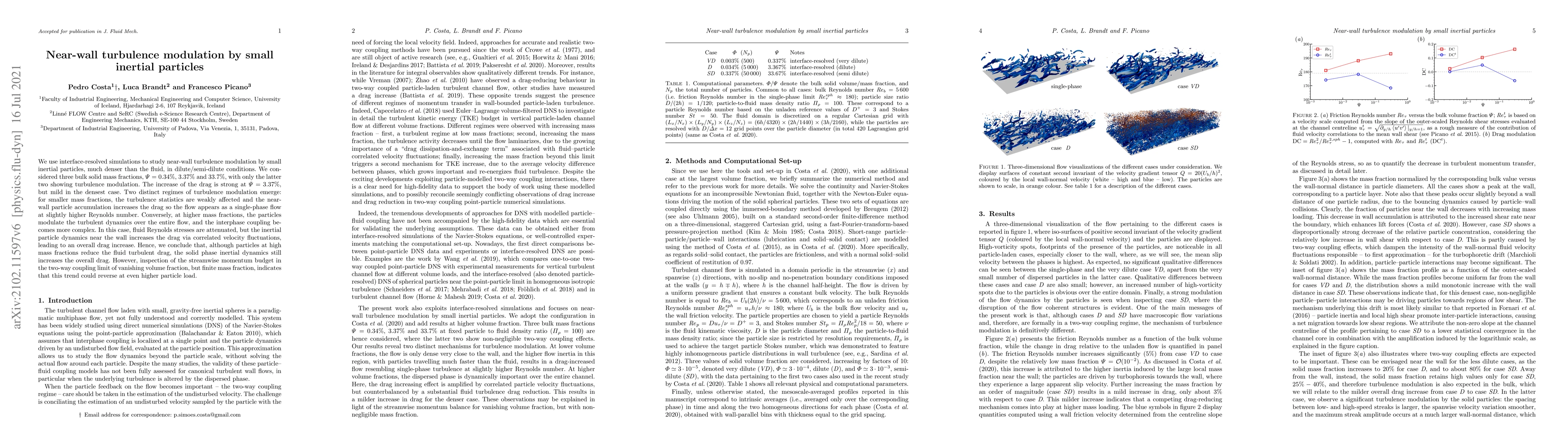 This study investigates how small inertial particles modulate near-wall turbulence in fluid flows, revealing two distinct regimes based on particle mass fractions. At higher fractions, particles modulate turbulence dynamics but increase overall drag due to correlated velocity fluctuations, despite reducing fluid turbulent drag.