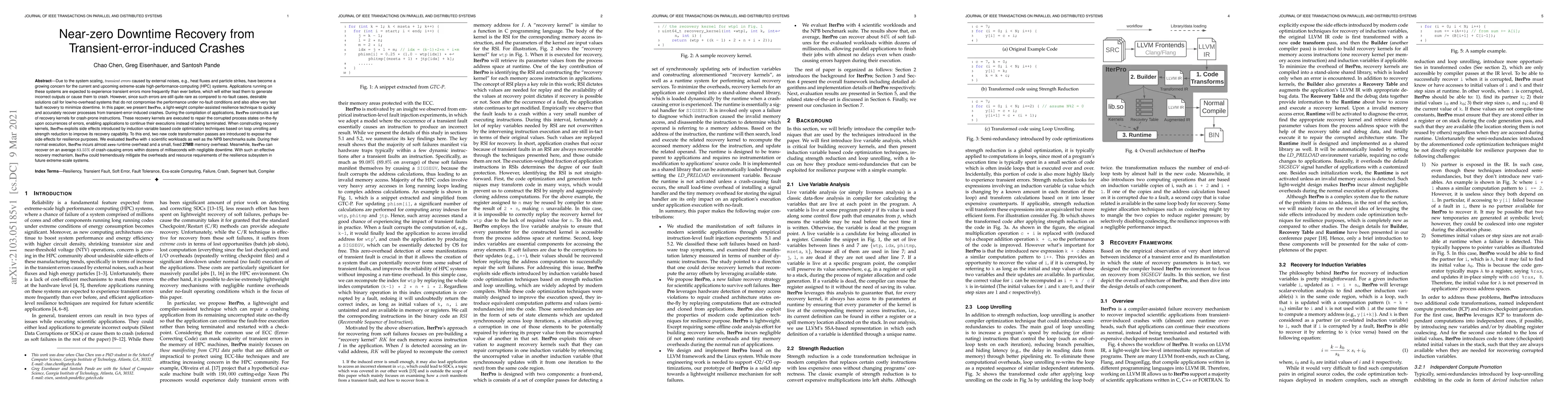 Due to the system scaling, transient errors caused by external noises, e.g., heat fluxes and particle strikes, have become a growing concern for the current and upcoming extreme-scale high-performance-computing (HPC) systems. However, since such errors are still quite rare as compared to no-fault cases, desirable solutions call for low/no-overhead systems that do not compromise the performance under no-fault conditions and also allow very fast fault recovery to minimize downtime. In this paper, we present IterPro, a light-weight compiler-assisted resilience technique to quickly and accurately recover processes from transient-error-induced crashes. IterPro repairs the corrupted process states on-the-fly upon occurrences of errors, enabling applications to continue their executions instead of being terminated. IterPro also exploits side effects introduced by induction variable based code optimization techniques to improve its recovery capability. To this end, two new code transformation passes are introduced to expose the side effects for resilience purposes. We evaluated IterPro with 4 scientific workloads as well as the NPB benchmarks suite. During their normal execution, IterPro incurs almost zero runtime overhead and a small, fixed 27MB memory overhead. Meanwhile, IterPro can recover on an average 83.55% of crash-causing errors within dozens of milliseconds with negligible downtime. With such an effective recovery mechanism, IterPro could tremendously mitigate the overheads and resource requirements of the resilience subsystem in future extreme-scale systems.