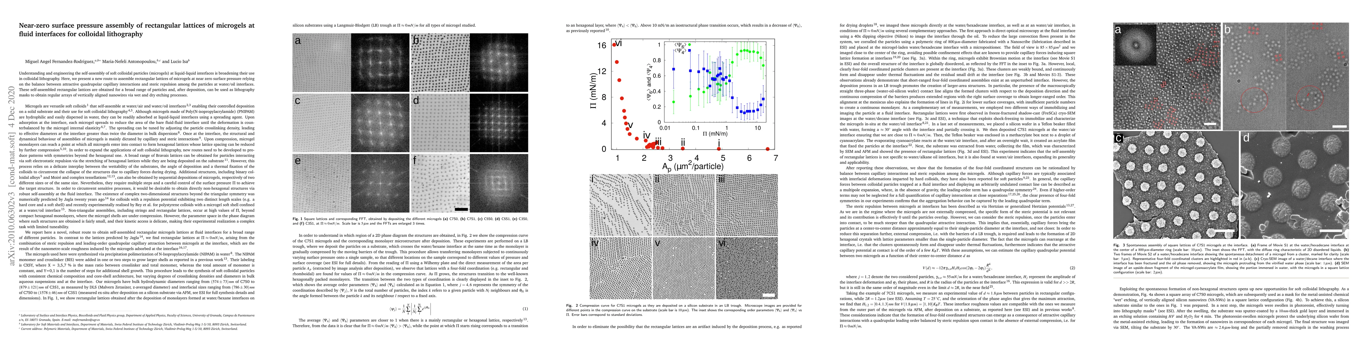 This paper presents a method for assembling rectangular lattices of microgels at water/oil interfaces under near-zero surface pressure, utilizing balanced attractive and repulsive forces. These lattices serve as lithography masks for creating regular arrays of vertically aligned nanowires through etching processes.
