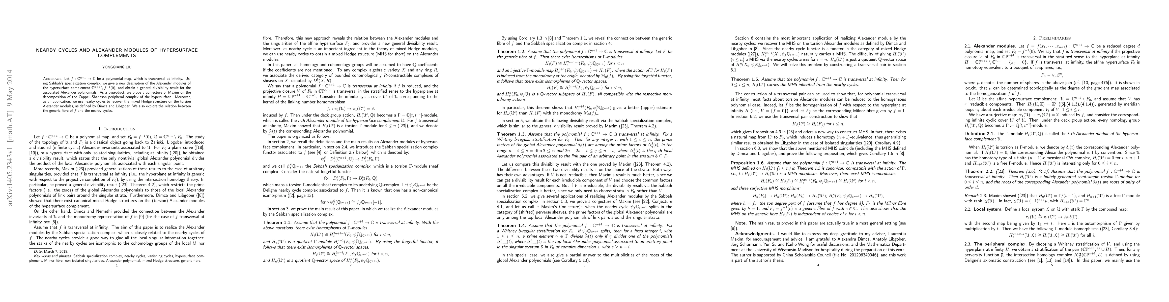 This paper presents a new description of the Alexander modules for hypersurface complements using Sabbah's specialization complex, leading to a general divisibility result for the Alexander polynomials and a proof of Maxim's conjecture on the decomposition of the peripheral complex. It also applies nearby cycles to recover the mixed Hodge structure on the torsion Alexander modules.