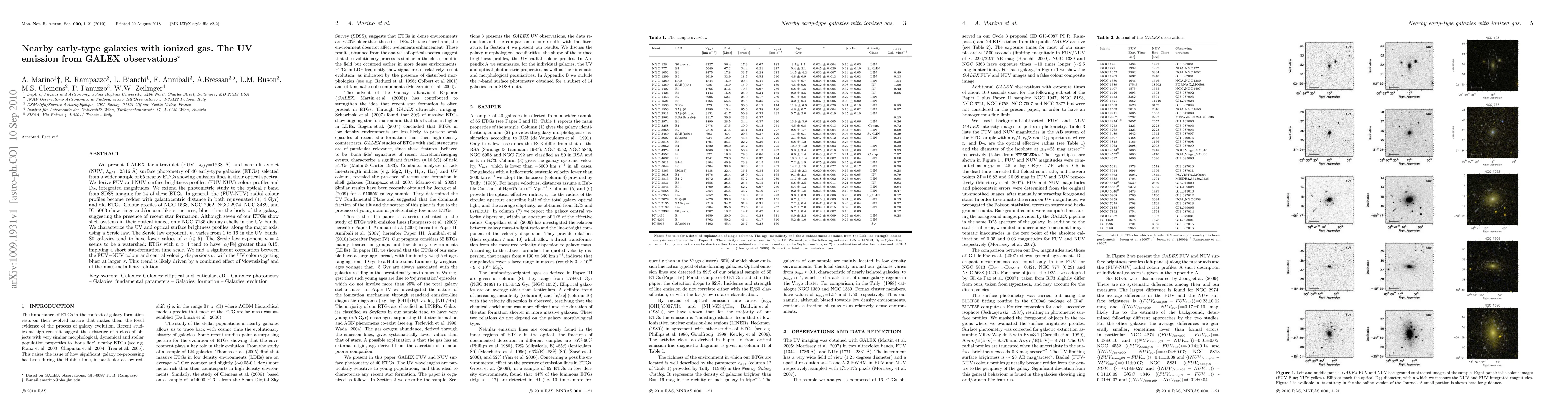 We present GALEX far-ultraviolet (FUV, $\lambda_{eff}$=1538 \AA) and near-ultraviolet (NUV, $\lambda_{eff}$=2316 \AA) surface photometry of 40 early-type galaxies (ETGs) selected from a wider sample of 65 nearby ETGs showing emission lines in their optical spectra. We derive FUV and NUV surface brightness profiles, (FUV-NUV) colour profiles and D$_{25}$ integrated magnitudes. We extend the photometric study to the optical {\it r} band from SDSS imaging for 14 of these ETGs. In general, the (FUV-NUV) radial colour profiles become redder with galactocentric distance in both rejuvenated ($\leq 4$ Gyr) and old ETGs. Colour profiles of NGC 1533, NGC 2962, NGC 2974, NGC 3489, and IC 5063 show rings and/or arm-like structures, bluer than the body of the galaxy, suggesting the presence of recent star formation. Although seven of our ETGs show shell systems in their optical image, only NGC 7135 displays shells in the UV bands. We characterize the UV and optical surface brightness profiles, along the major axis, using a Sersic law. The Sersic law exponent, $n$, varies from 1 to 16 in the UV bands. S0 galaxies tend to have lower values of $n$ ($\leq5$). The Sersic law exponent $n=4$ seems to be a watershed: ETGs with $n>4$ tend to have [$\alpha$/Fe] greater than 0.15, implying a short star-formation time scale. We find a significant correlation between the FUV$-$NUV colour and central velocity dispersions $\sigma$, with the UV colours getting bluer at larger $\sigma$. This trend is likely driven by a combined effect of `downsizing' and of the mass-metallicity relation.