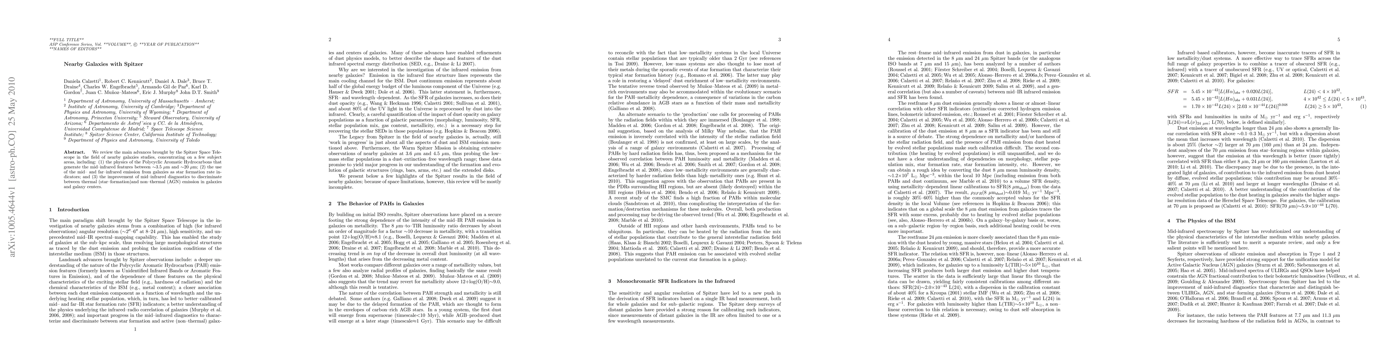 We review the main advances brought by the Spitzer Space Telescope in the field of nearby galaxies studies, concentrating on a few subject areas, including: (1) the physics of the Polycyclic Aromatic Hydrocarbons that generate the mid-infrared features between ~3.5 micron and ~20 micron; (2) the use of the mid- and far-infrared emission from galaxies as star formation rate indicators; and (3) the improvement of mid-infrared diagnostics to discriminate between thermal (star-formation) and non-thermal (AGN) emission in galaxies and galaxy centers.