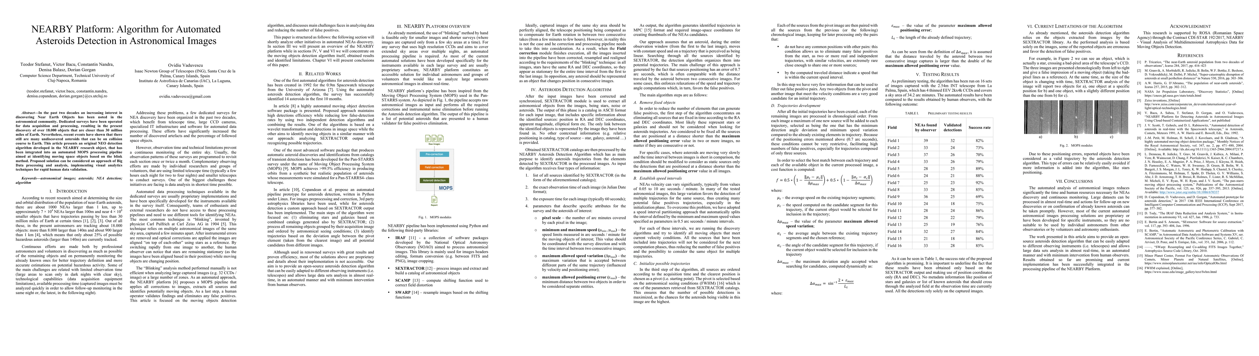 In the past two decades an increasing interest in discovering Near Earth Objects has been noted in the astronomical community. Dedicated surveys have been operated for data acquisition and processing, resulting in the present discovery of over 18.000 objects that are closer than 30 million miles of Earth. Nevertheless, recent events have shown that there still are many undiscovered asteroids that can be on collision course to Earth. This article presents an original NEO detection algorithm developed in the NEARBY research object, that has been integrated into an automated MOPS processing pipeline aimed at identifying moving space objects based on the blink method. Proposed solution can be considered an approach of Big Data processing and analysis, implementing visual analytics techniques for rapid human data validation.