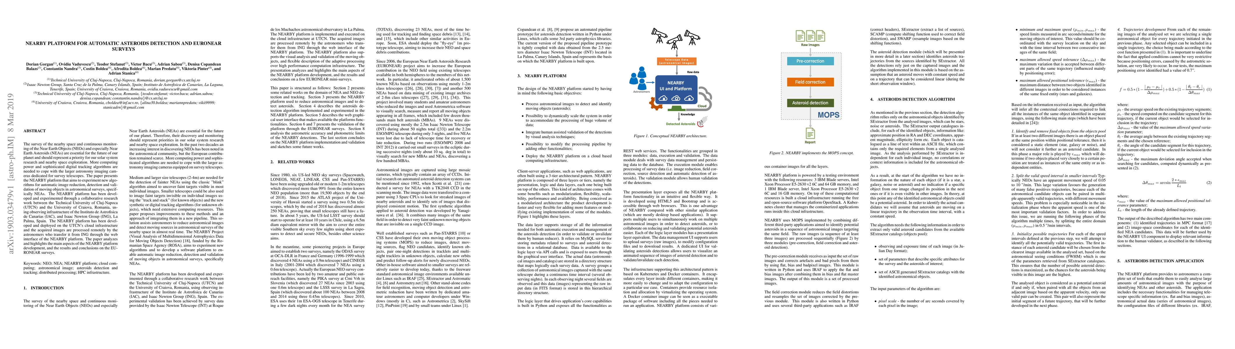 The NEARBY platform is designed to automatically detect and validate Near Earth Asteroids (NEAs) using advanced image processing algorithms. Developed by researchers in Romania and Spain, it leverages cloud infrastructure and remote processing to enhance NEO surveys, with promising results from the EURONEAR surveys.