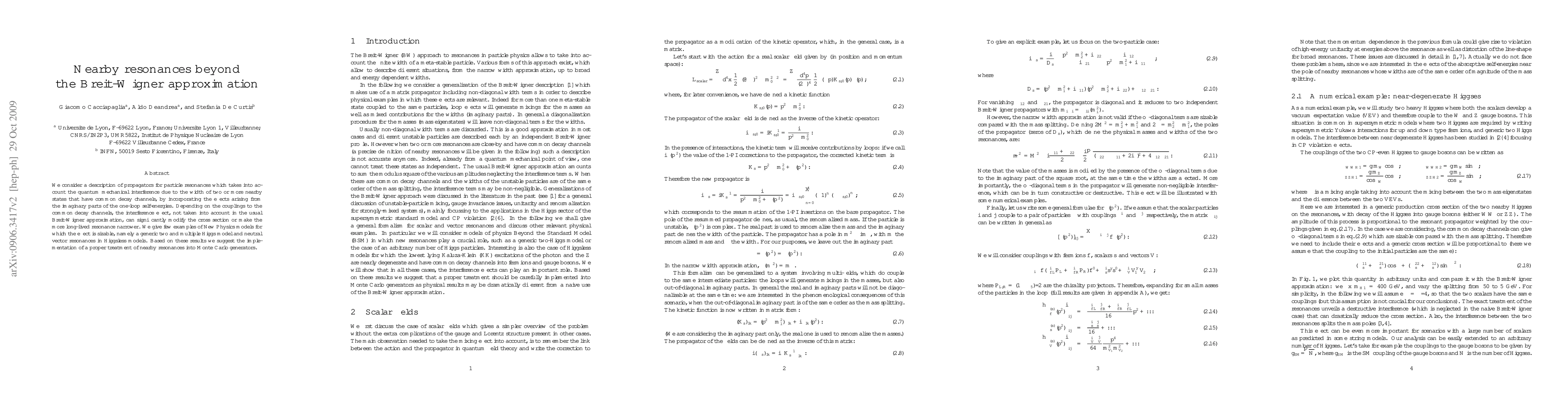 We consider a description of propagators for particle resonances which takes into account the quantum mechanical interference due to the width of two or more nearby states that have common decay channels, by incorporating the effects arising from the imaginary parts of the one-loop self-energies. Depending on the couplings to the common decay channels, the interference effect, not taken into account in the usual Breit-Wigner approximation, can significantly modify the cross section or make the more long-lived resonance narrower. We give few examples of New Physics models for which the effect is sizable, namely a generic two and multiple Higgs model and neutral vector resonances in Higgsless models. Based on these results we suggest the implementation of a proper treatment of nearby resonances into Monte Carlo generators.