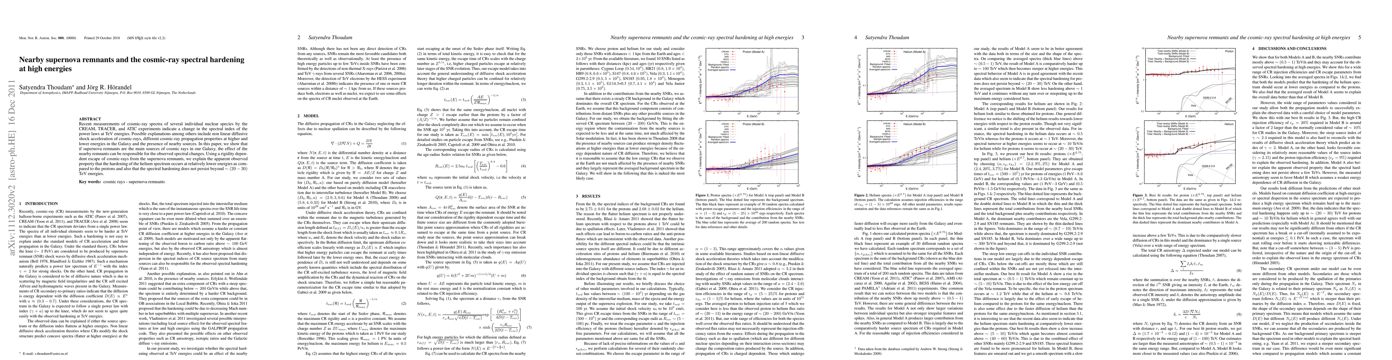 This paper demonstrates that nearby supernova remnants may account for the observed spectral hardening of cosmic rays at high energies, as measured by CREAM, TRACER, and ATIC experiments. The study attributes the differing spectral hardening between helium and protons to rigidity-dependent escape mechanisms from these remnants.