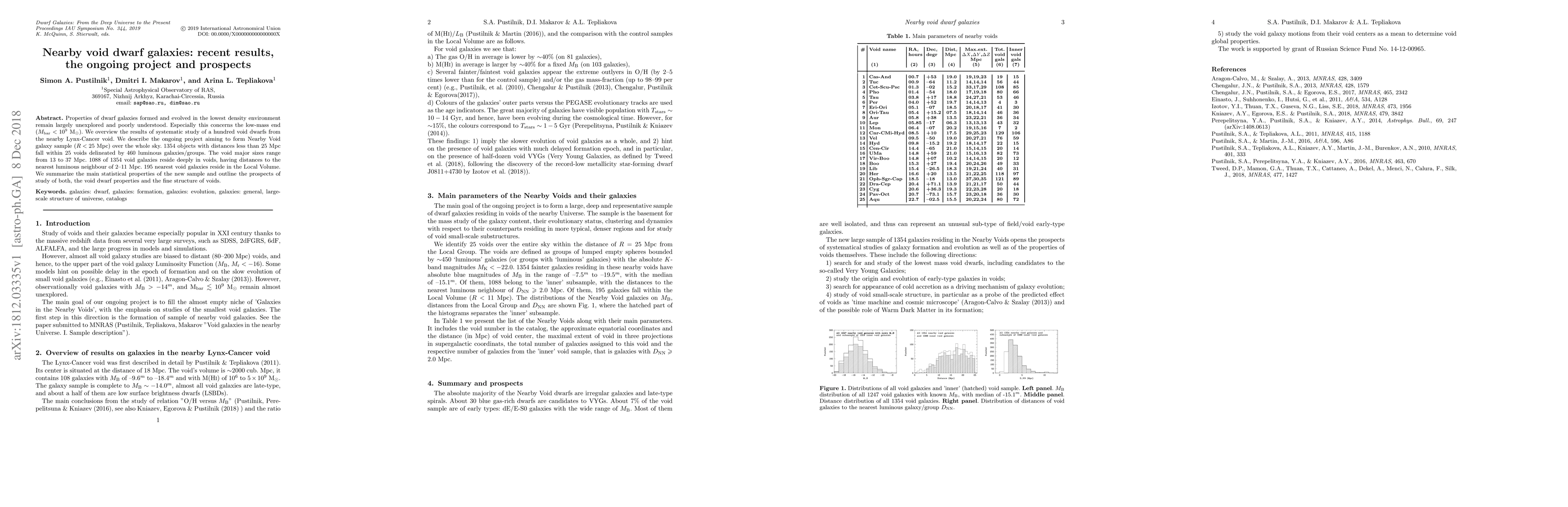 Properties of dwarf galaxies formed and evolved in the lowest density environment remain largely unexplored and poorly understood. Especially this concerns the low-mass end (M_bar < 10^9 Mo). We overview the results of systematic study of a hundred void dwarfs from the nearby Lynx-Cancer void. We describe the ongoing project aiming to form Nearby Void galaxy sample (R < 25 Mpc) over the whole sky. 1354 objects with distances less than 25 Mpc fall within 25 voids delineated by 460 luminous galaxies/groups. The void major sizes range from 13 to 37 Mpc. 1088 of 1354 void galaxies reside deeply in voids, having distances to the nearest luminous neighbour of 2-11 Mpc. 195 nearest void galaxies reside in the Local Volume. We summarize the main statistical properties of the new sample and outline the prospects of study of both, the void dwarf properties and the fine structure of voids.