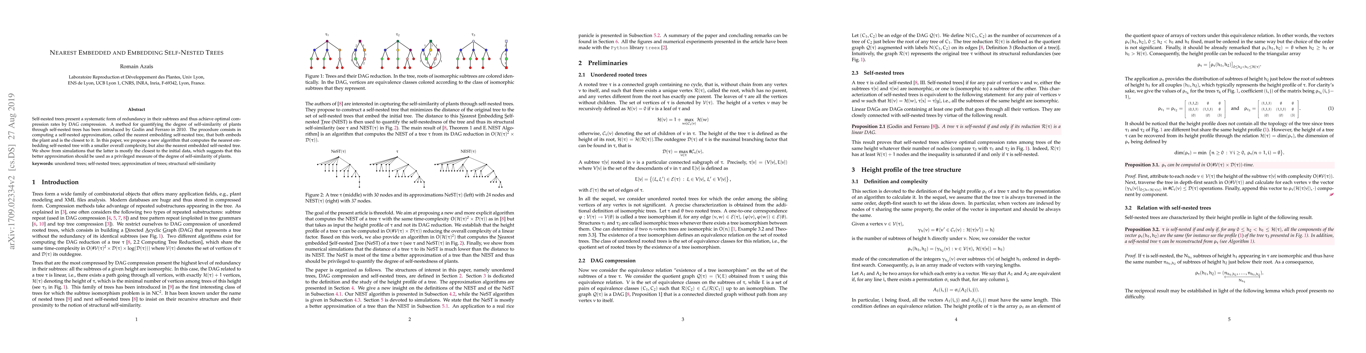 Self-nested trees present a systematic form of redundancy in their subtrees and thus achieve optimal compression rates by DAG compression. A method for quantifying the degree of self-similarity of plants through self-nested trees has been introduced by Godin and Ferraro in 2010. The procedure consists in computing a self-nested approximation, called the nearest embedding self-nested tree, that both embeds the plant and is the closest to it. In this paper, we propose a new algorithm that computes the nearest embedding self-nested tree with a smaller overall complexity, but also the nearest embedded self-nested tree. We show from simulations that the latter is mostly the closest to the initial data, which suggests that this better approximation should be used as a privileged measure of the degree of self-similarity of plants.