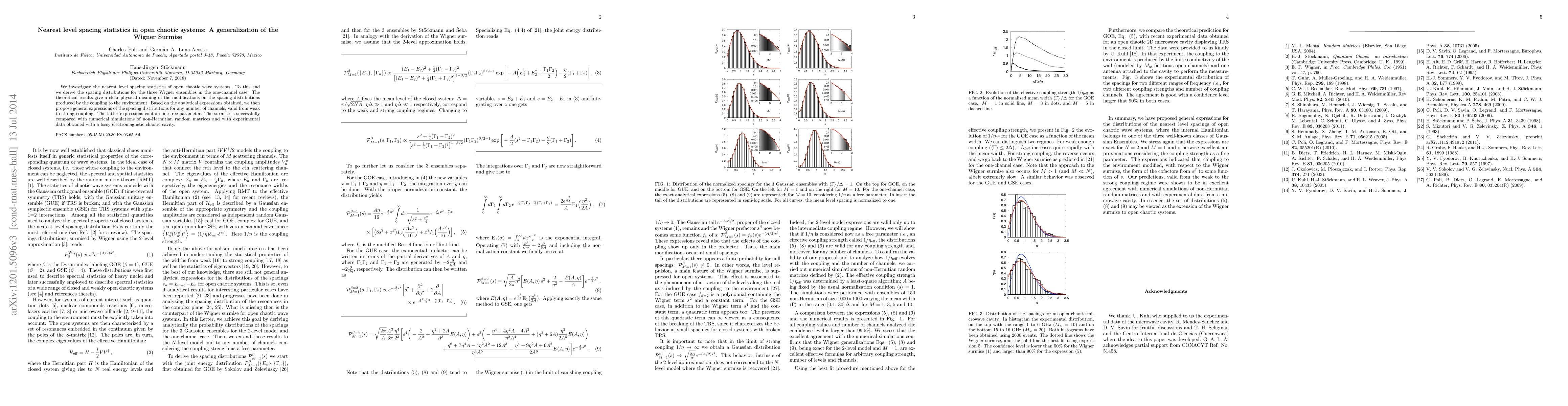 This paper investigates the nearest level spacing statistics in open chaotic systems, deriving spacing distributions for the three Wigner ensembles in one-channel cases and proposing general expressions for any number of channels. The results are validated against numerical simulations and experimental data from lossy electromagnetic chaotic cavities.