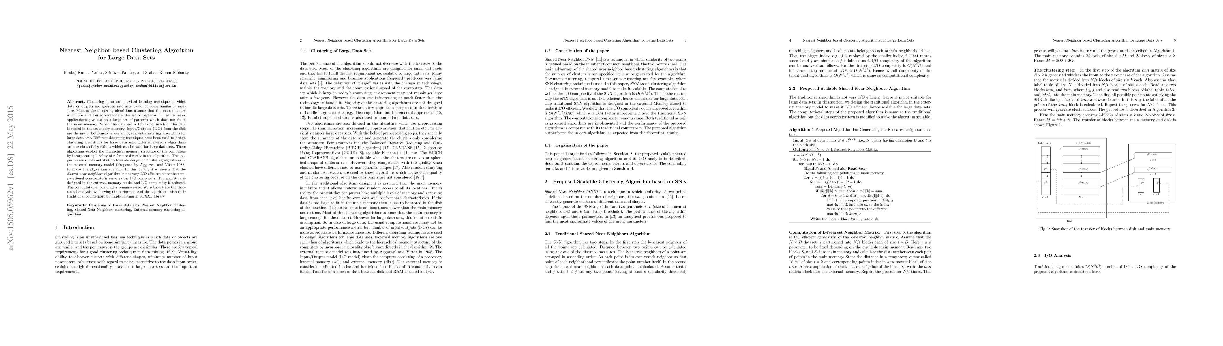 This paper proposes an efficient nearest neighbor based clustering algorithm for large datasets that fits into the external memory model, reducing I/O complexity while maintaining computational complexity. The performance is demonstrated through implementation using the STXXL library.