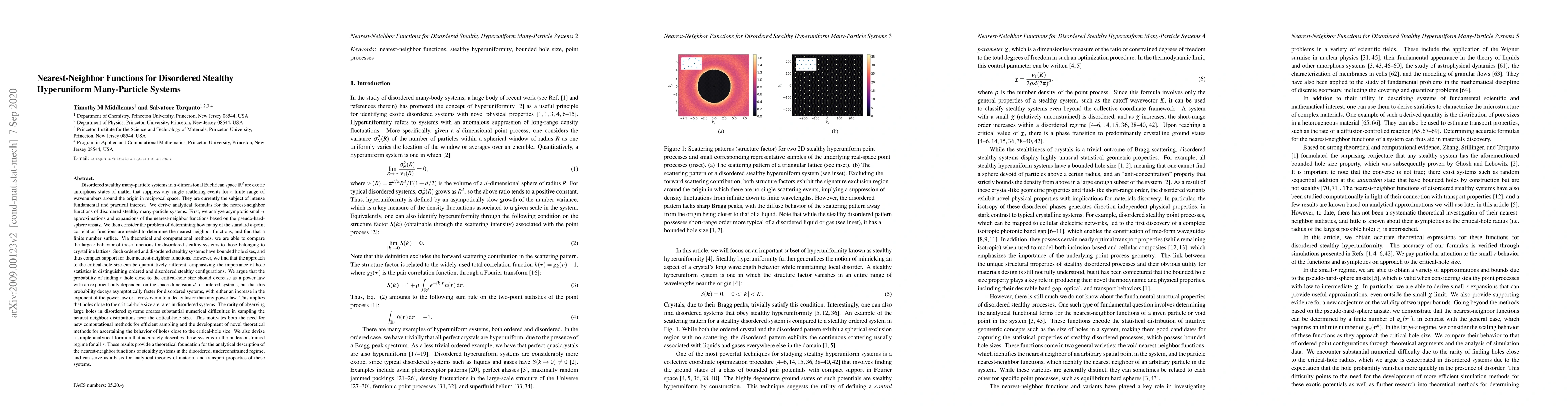 Researchers developed analytical formulas for nearest-neighbor functions in disordered stealthy hyperuniform many-particle systems, finding they behave differently from crystalline lattices near the critical-hole size.