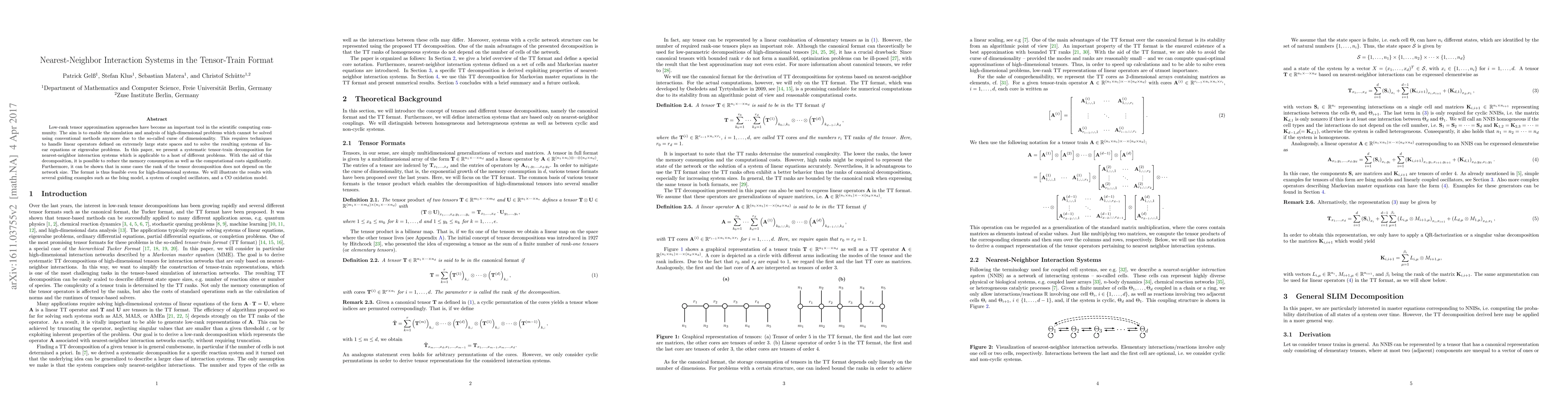 Low-rank tensor approximation approaches have become an important tool in the scientific computing community. The aim is to enable the simulation and analysis of high-dimensional problems which cannot be solved using conventional methods anymore due to the so-called curse of dimensionality. This requires techniques to handle linear operators defined on extremely large state spaces and to solve the resulting systems of linear equations or eigenvalue problems. In this paper, we present a systematic tensor-train decomposition for nearest-neighbor interaction systems which is applicable to a host of different problems. With the aid of this decomposition, it is possible to reduce the memory consumption as well as the computational costs significantly. Furthermore, it can be shown that in some cases the rank of the tensor decomposition does not depend on the network size. The format is thus feasible even for high-dimensional systems. We will illustrate the results with several guiding examples such as the Ising model, a system of coupled oscillators, and a CO oxidation model.