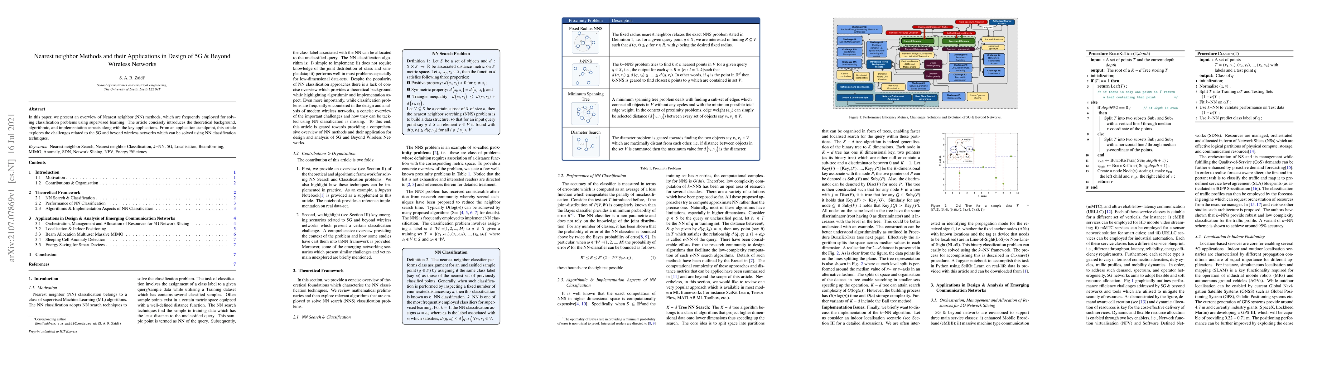 In this paper, we present an overview of Nearest neighbor (NN) methods, which are frequently employed for solving classification problems using supervised learning. The article concisely introduces the theoretical background, algorithmic, and implementation aspects along with the key applications. From an application standpoint, this article explores the challenges related to the 5G and beyond wireless networks which can be solved using NN classification techniques.