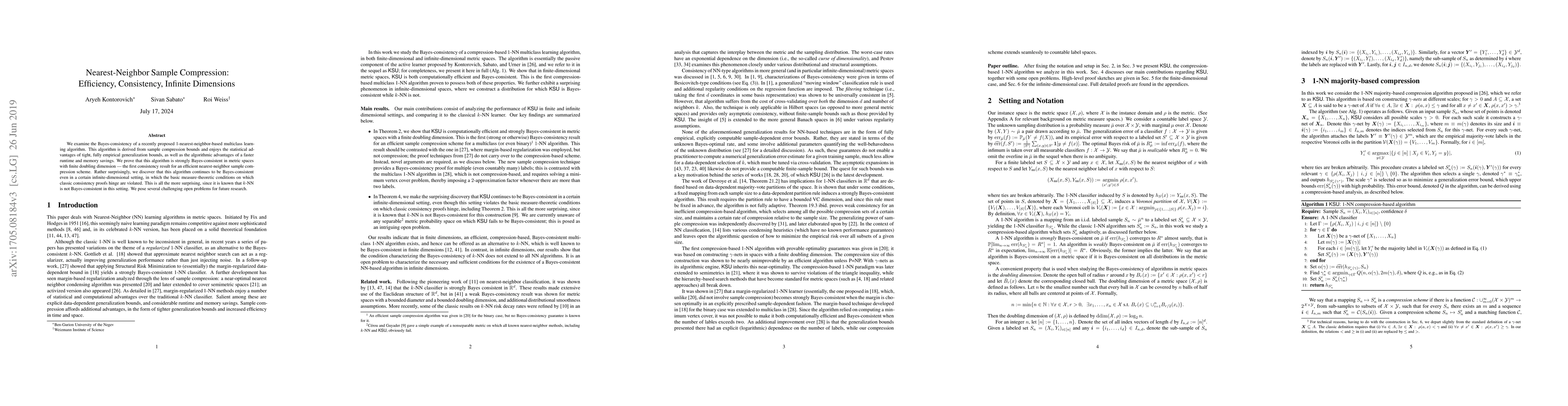 This paper proves the strong Bayes-consistency of a 1-nearest-neighbor algorithm derived from sample compression, demonstrating its efficacy in finite-dimensional metric spaces and surprisingly, even in certain infinite-dimensional settings where traditional consistency proofs fail. It poses open problems for future research on this efficient, memory-saving learning approach.